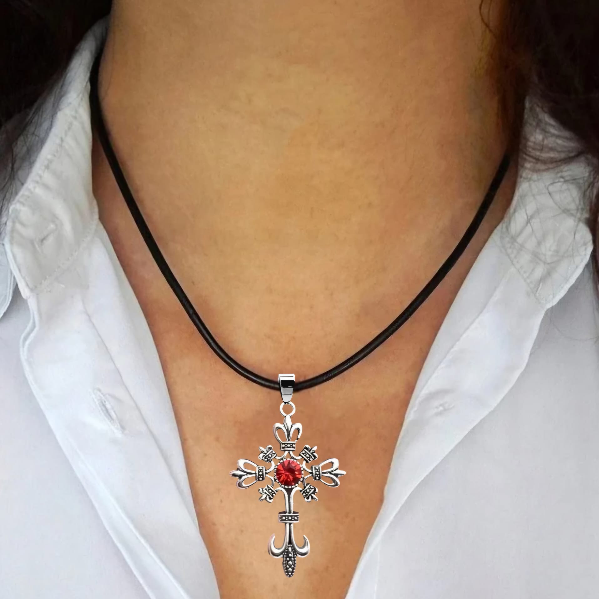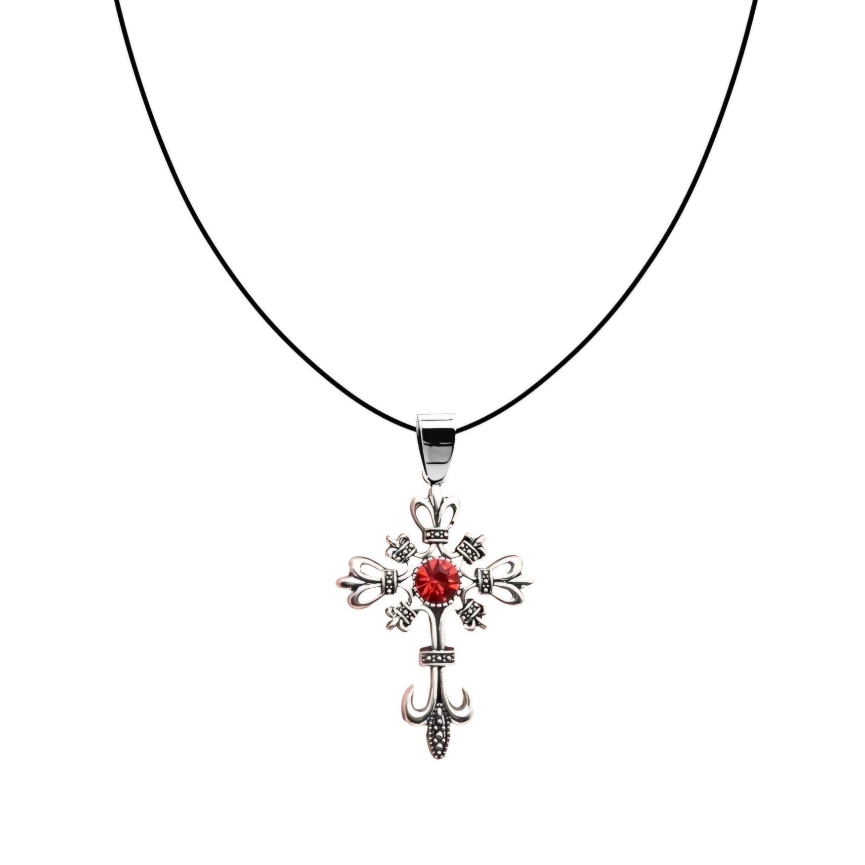 Naszyjnik w stylu gotyckim z zawieszką w kształcie pięknie zdobionego krzyża w kolorze srebrnym z czerwoną cyrkonią.