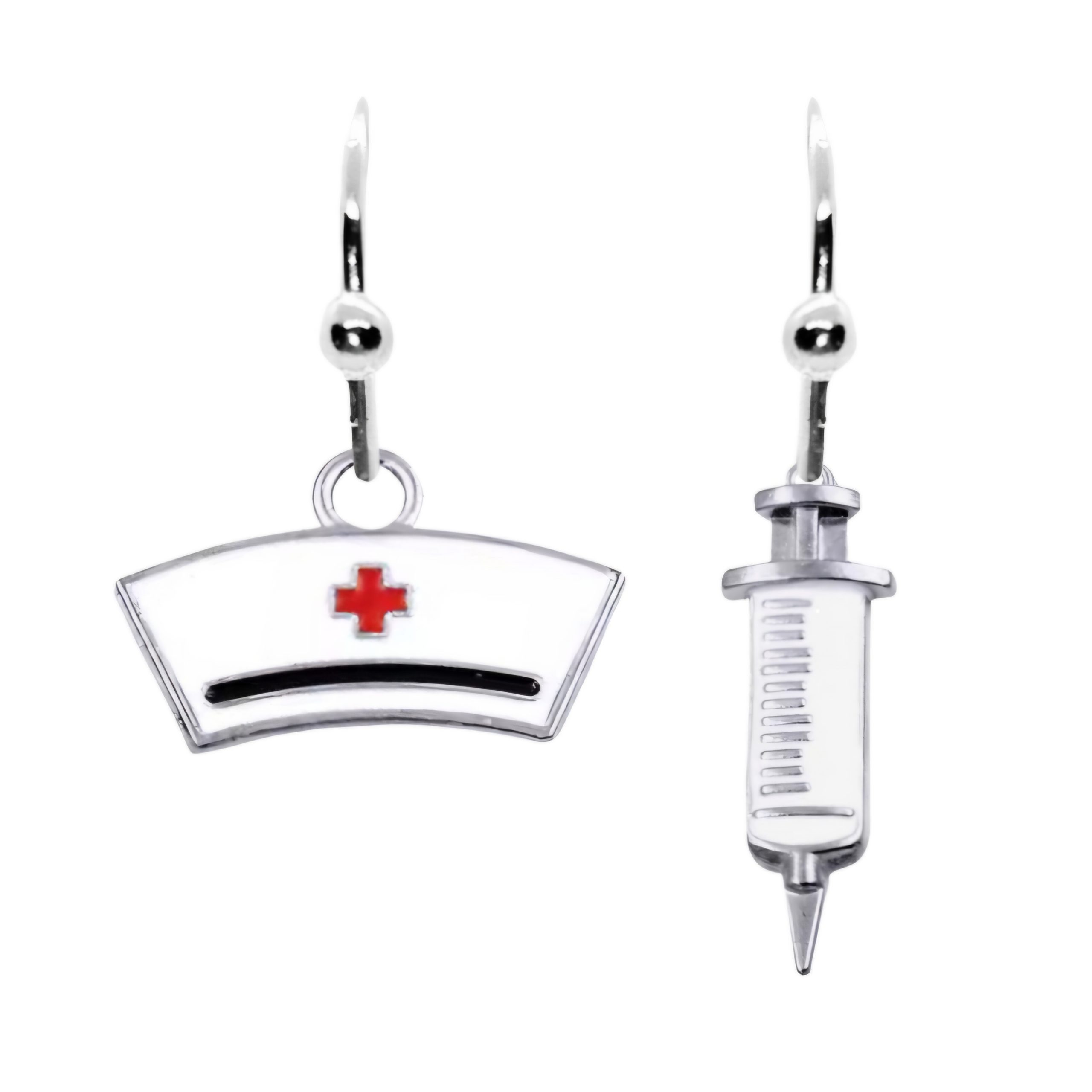 Kolczyki z zawieszkami w kształcie czepka pielęgniarskiego oraz strzykawki, dealny prezent dla lekarza lub pielęgniarki.
