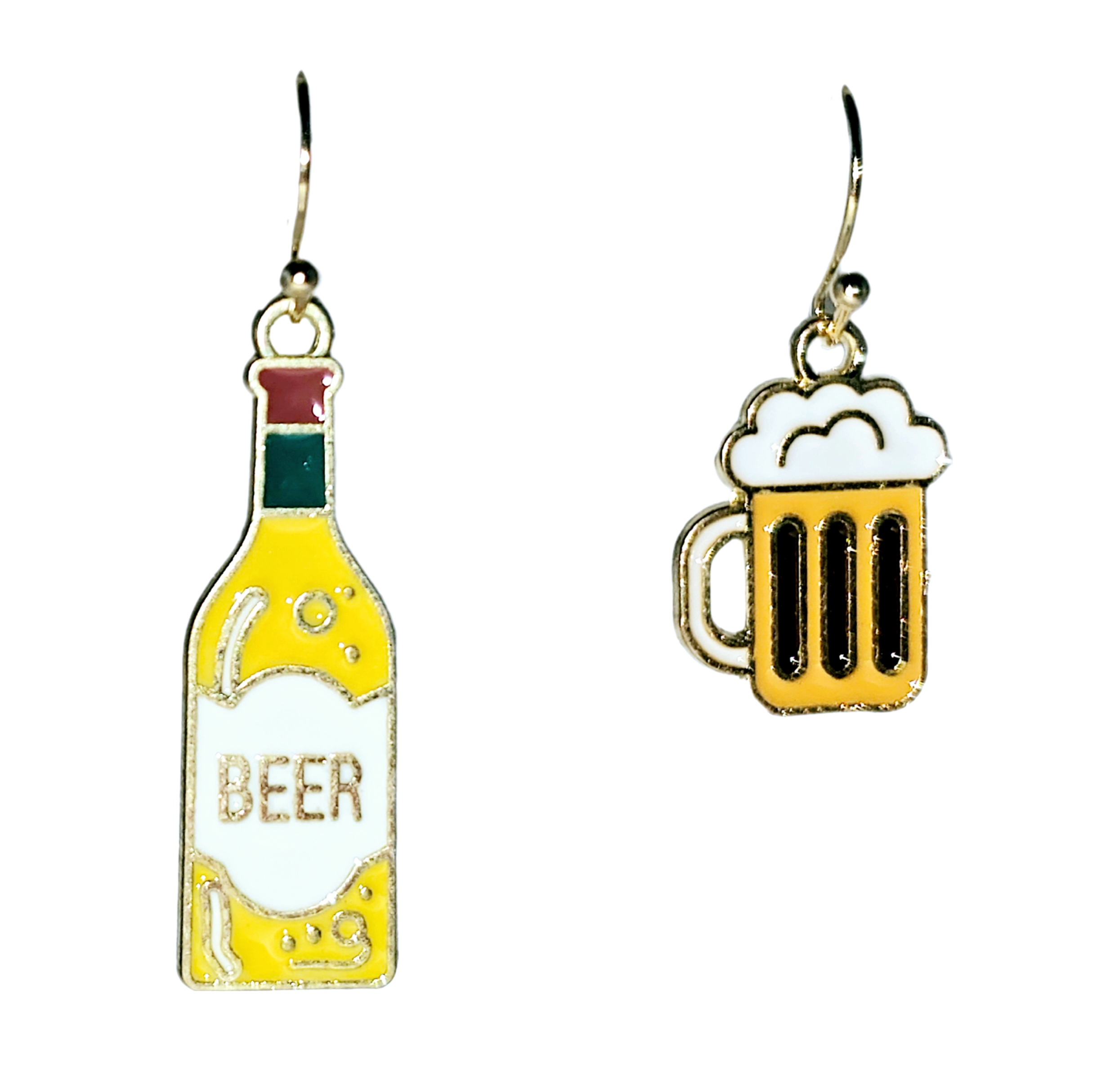 Kolczyki z zawieszkami w kształcie butelki i kufla pełnych piwa z pianką.