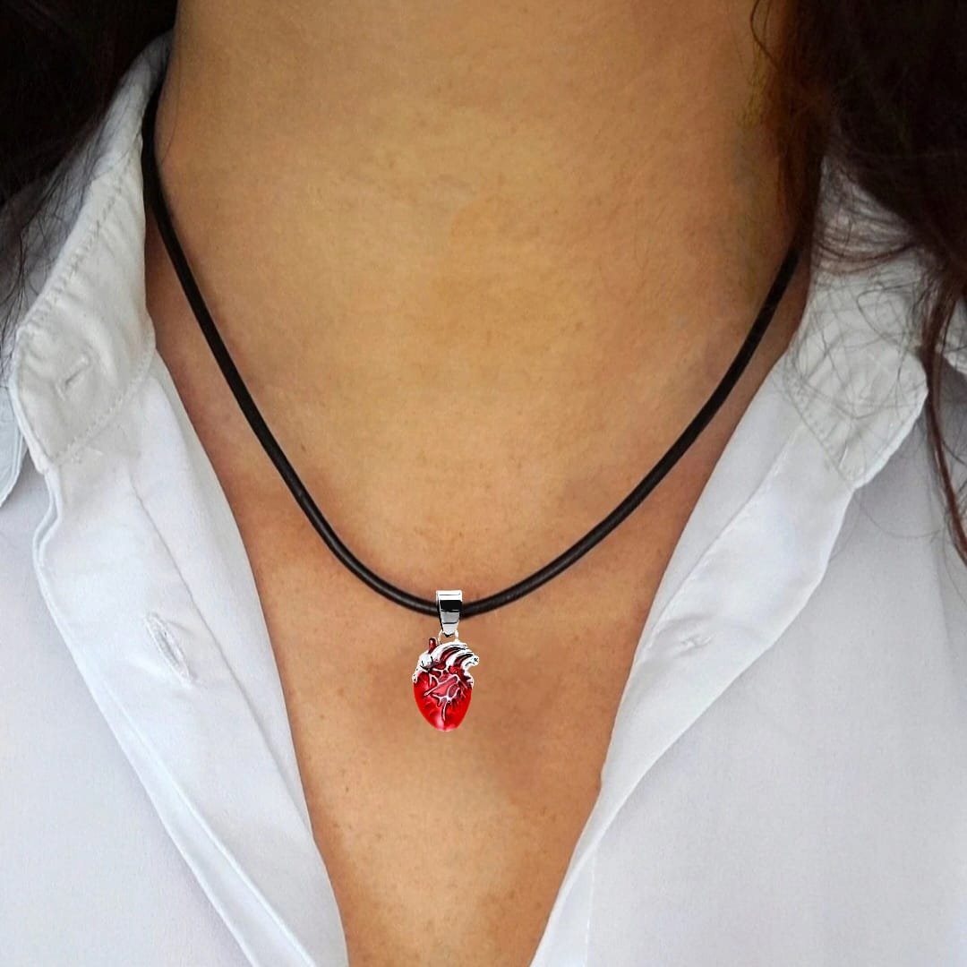 Naszyjnik z zawieszką w kształcie przypominającym ludzkie, anatomiczne serce.