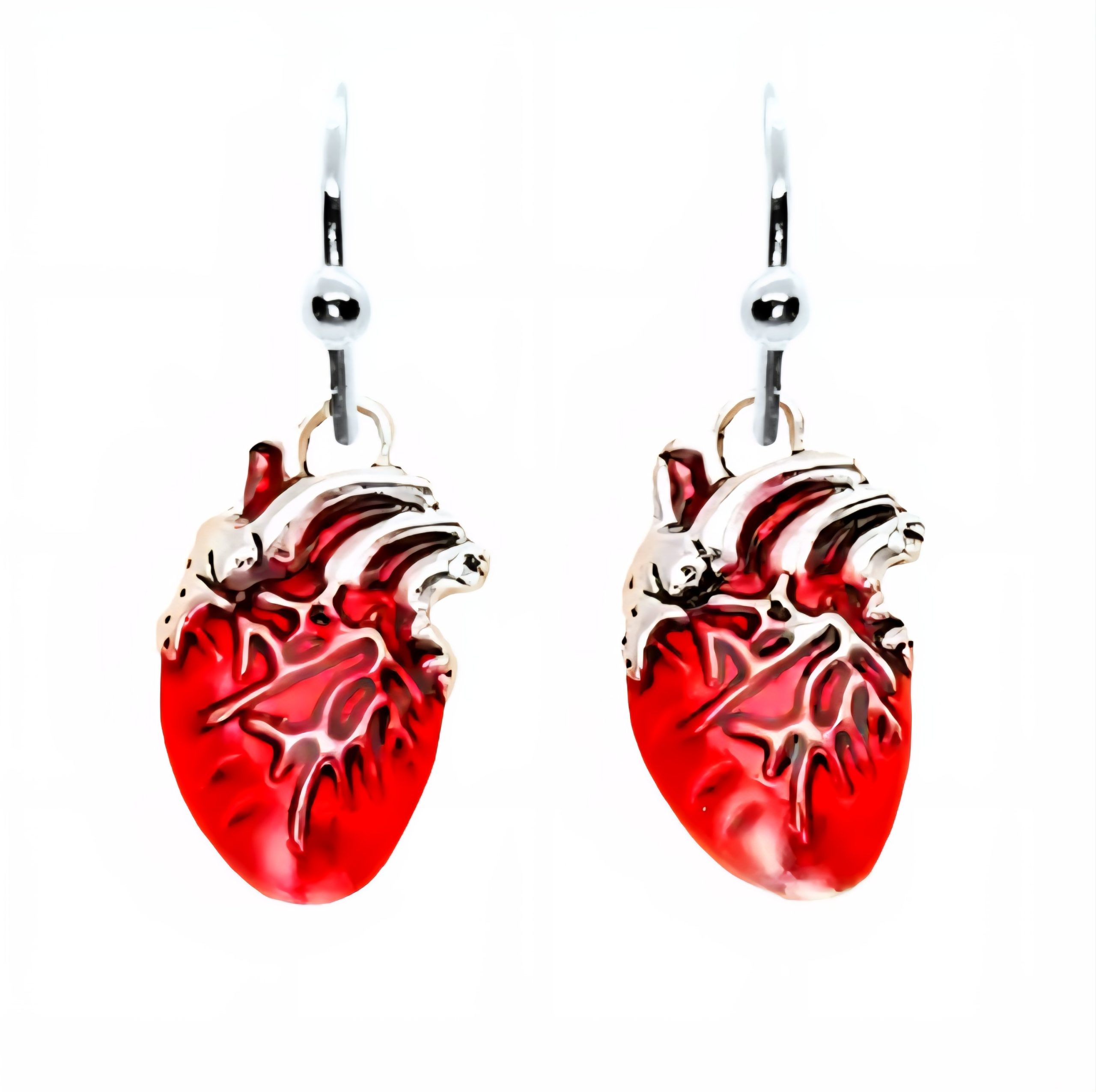 Kolczyki z zawieszkami przypominającymi prawdziwe, ludzkie serce.