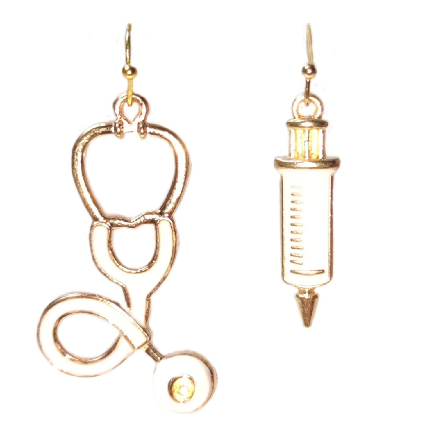 Kolczyki z zawieszkami w kształcie stetoskopu lekarskiego oraz strzykawki, idealny prezent dla lekarza lub pielęgniarki.