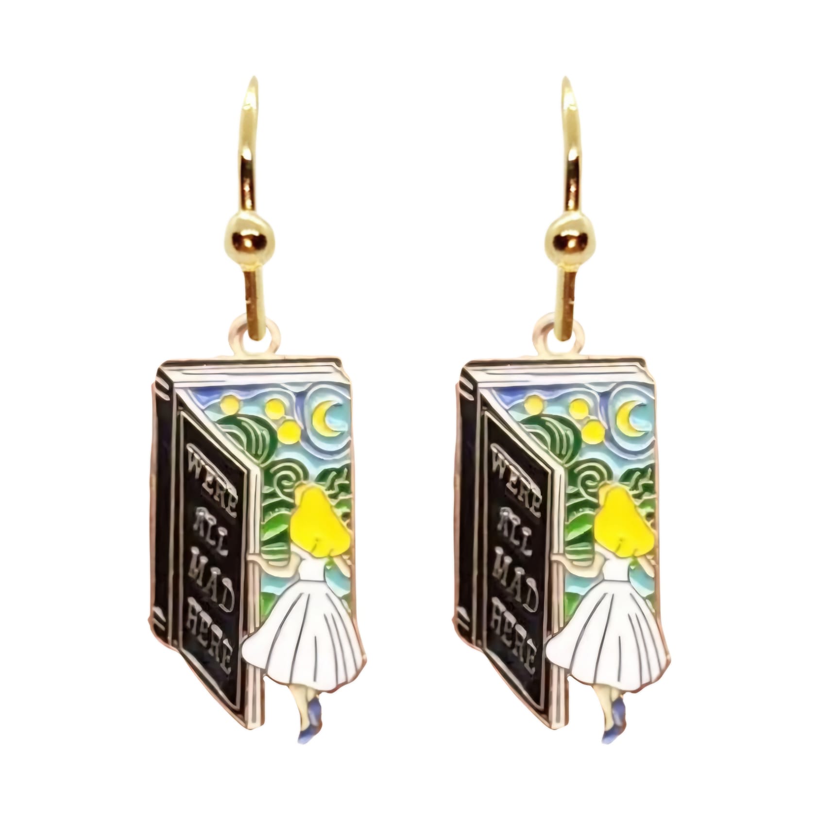 Kolczyki z zawieszkami w kształcie pary książek z wchodzącą do baśni Alicją z Krainy Czarów.