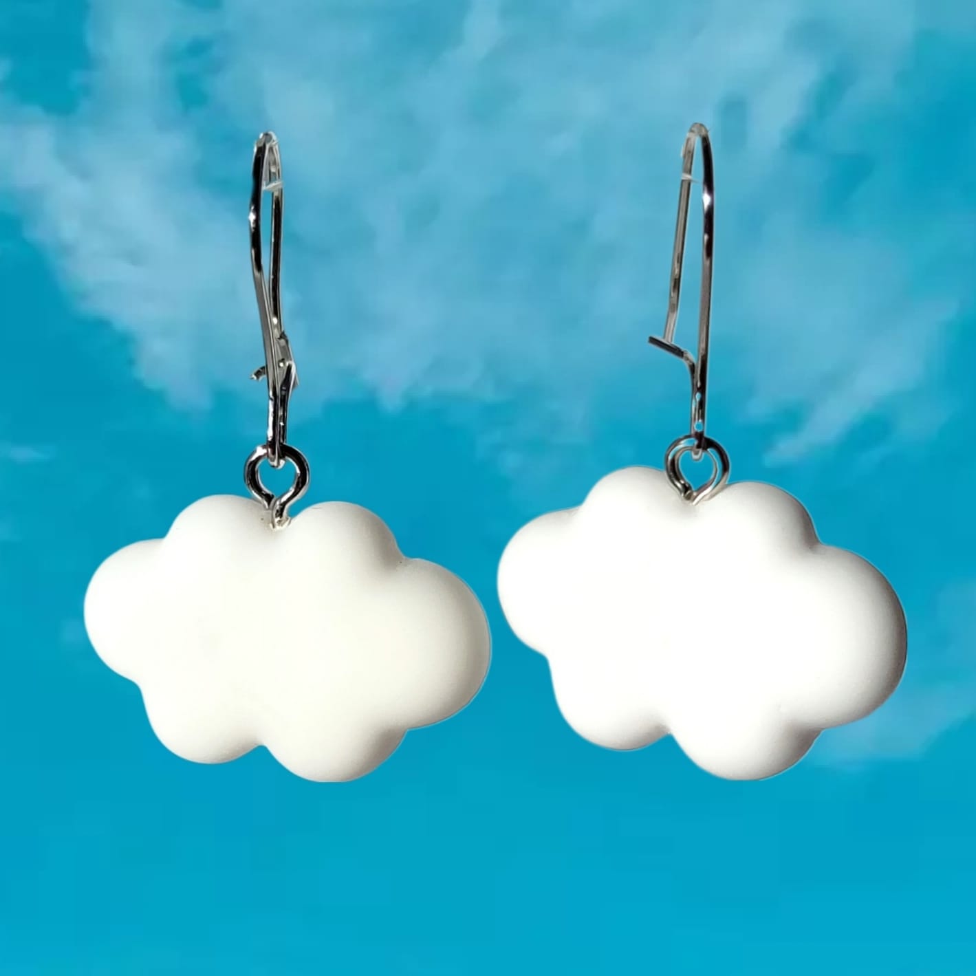 Kolczyki z zawieszkami w kształcie puchatych, białych obłoczków.