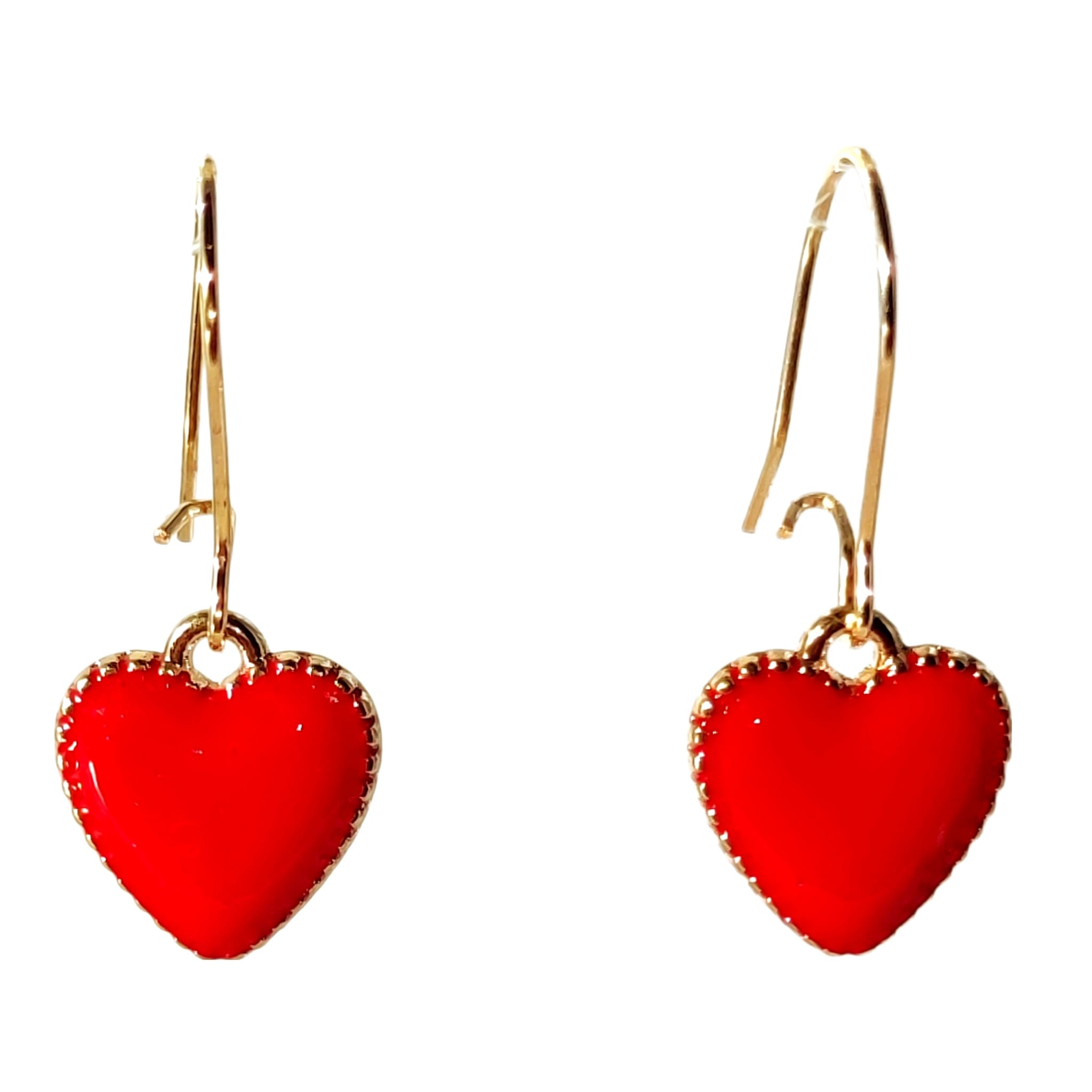 Kolczyki z zawieszkami w kształcie klasycznych, czerwono – złotych serduszek.