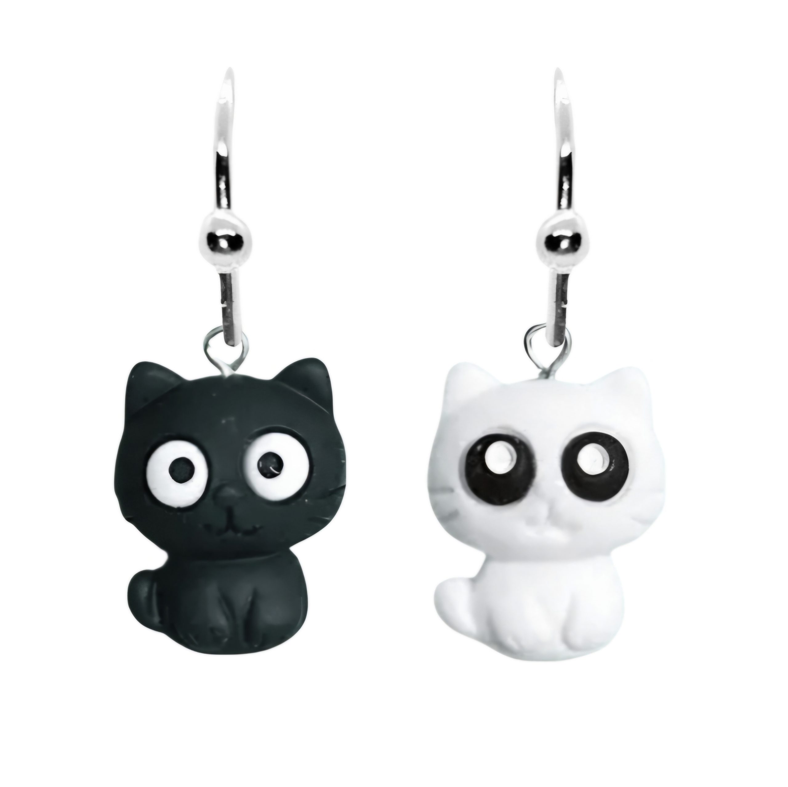 Kolczyki z zawieszkami w kształcie białego i czarnego kotka.