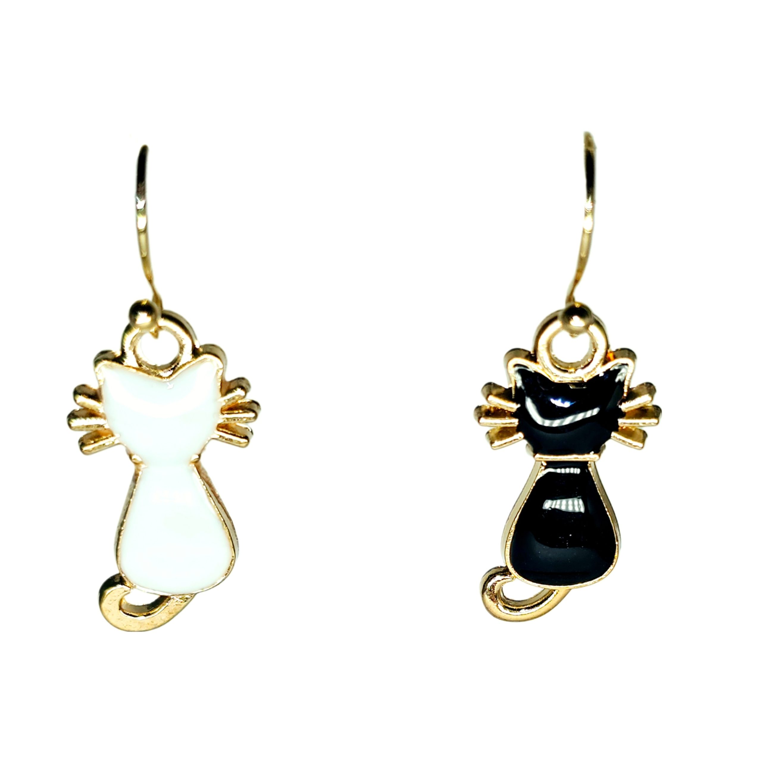 Kolczyki z zawieszkami w kształcie białego i czarnego kotka.