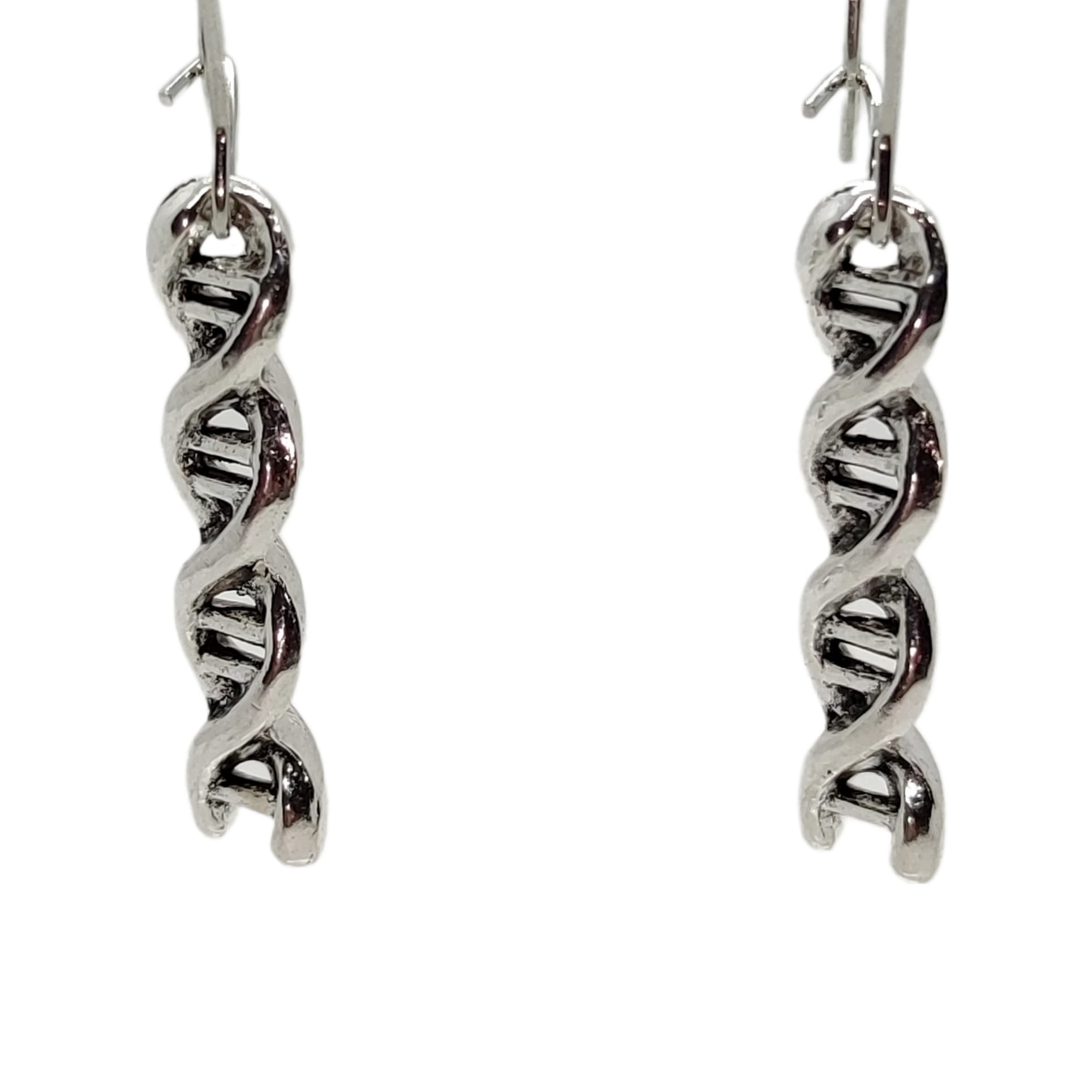 Kolczyki z zawieszkami w kształcie związku chemicznego kwasu dna w kolorze srebrnym.