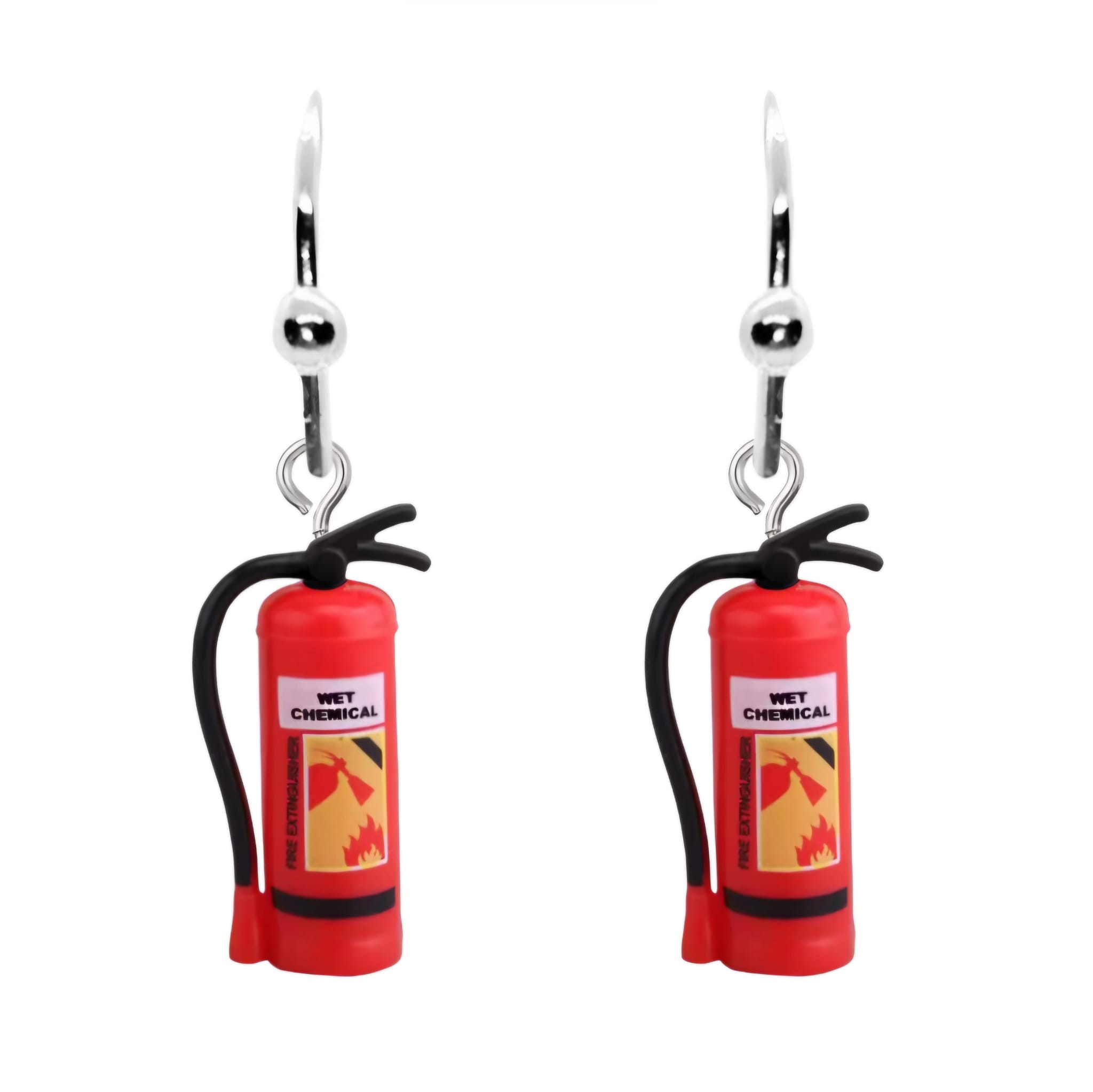 Kolczyki z zawieszkami w kształcie bardzo podobnych do prawdziwych gaśnic przeciwpożarowych.
