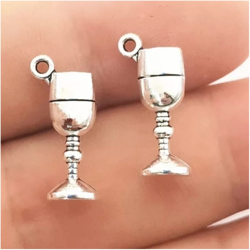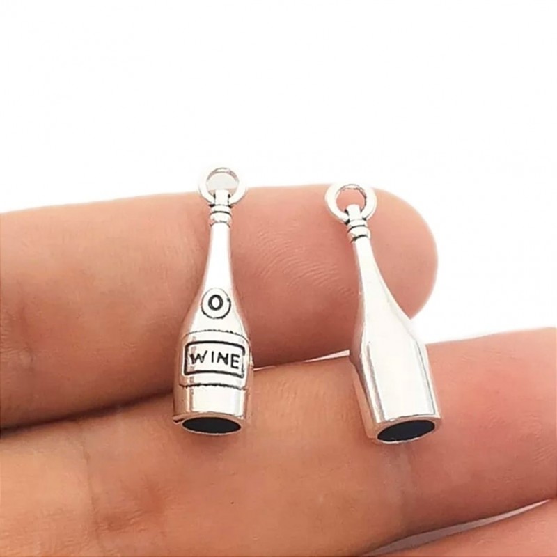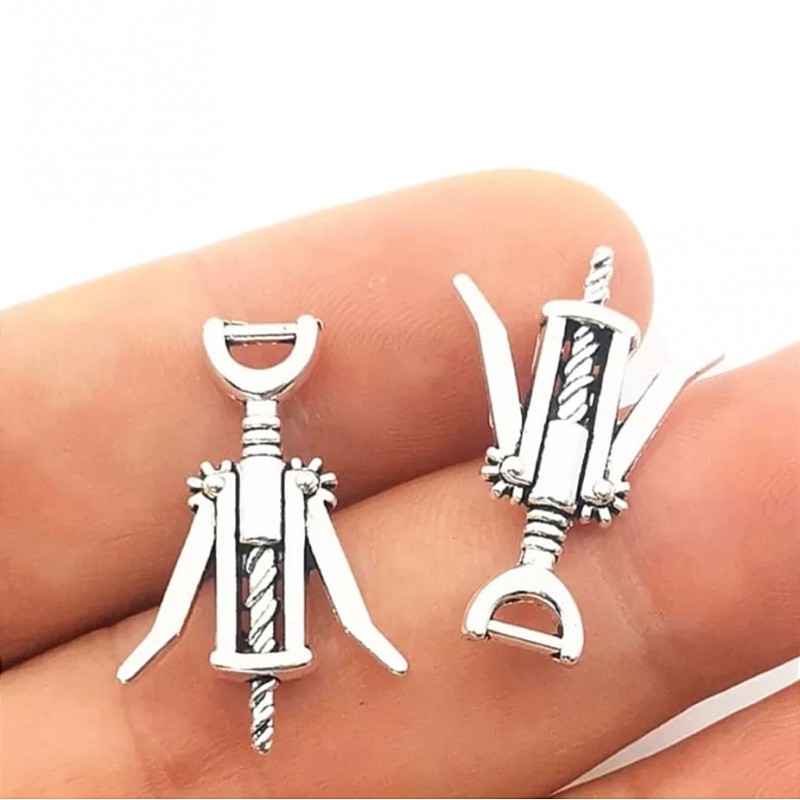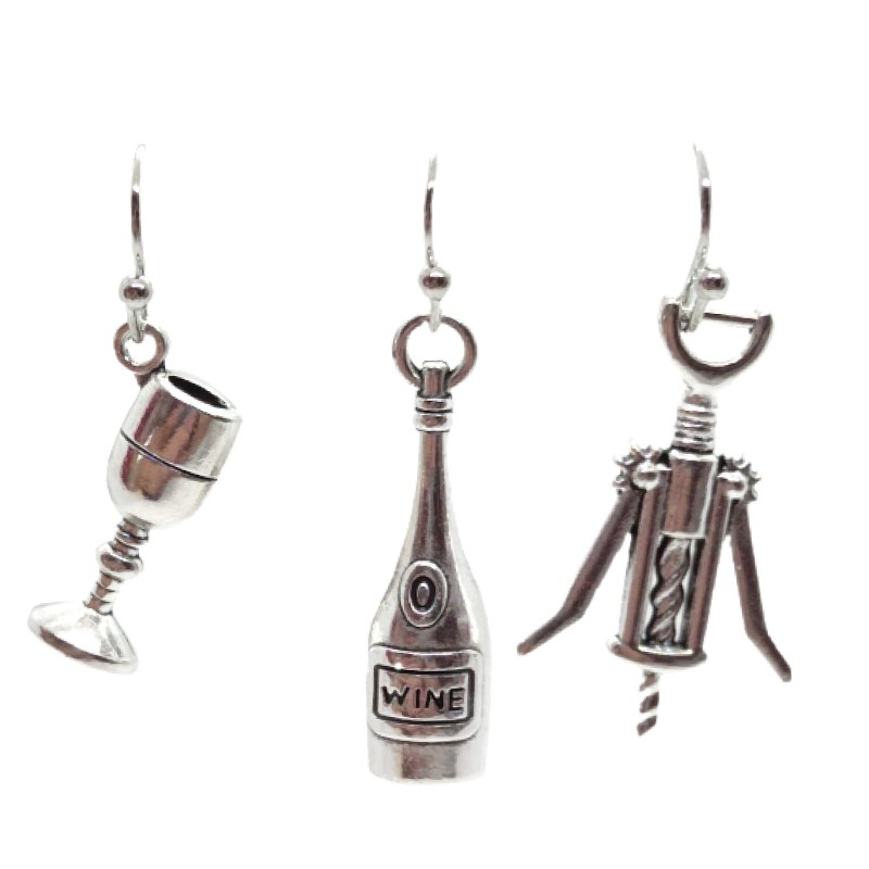 Kolczyki z zawieszkami w kształcie zestawu imprezowego: butelka wina, korkociąg i kieliszek, w kolorze srebrnym.