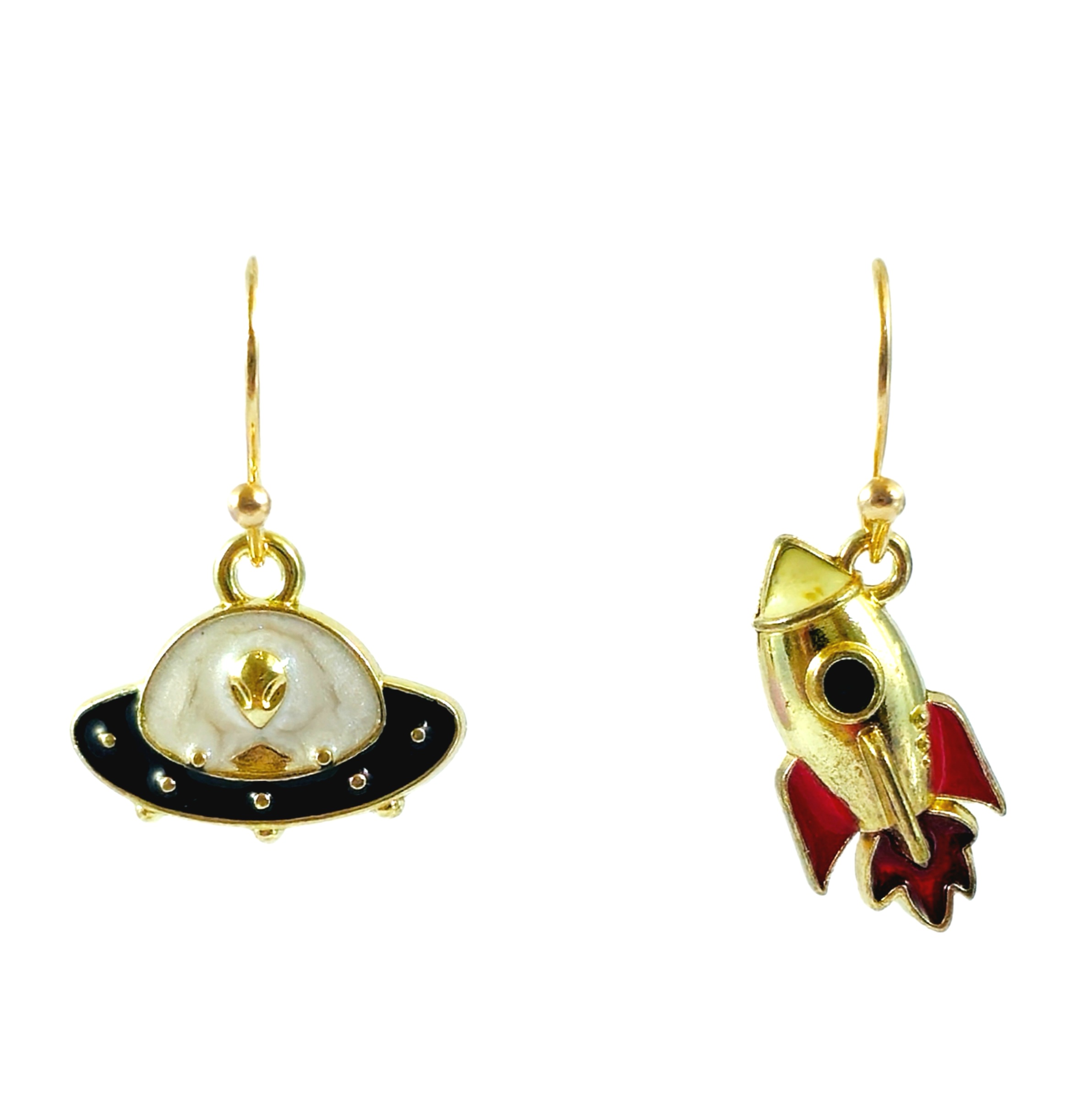 Kolczyki z zawieszkami ze statkiem kosmicznym i rakietą.