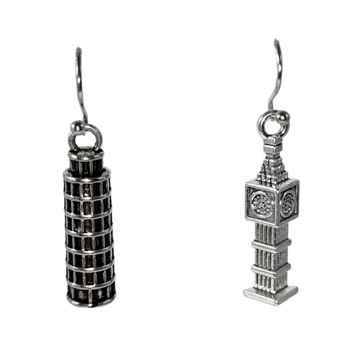 Kolczyki z zawieszkami w kształcie krzywej wieży w Pizie oraz Big-Bena.