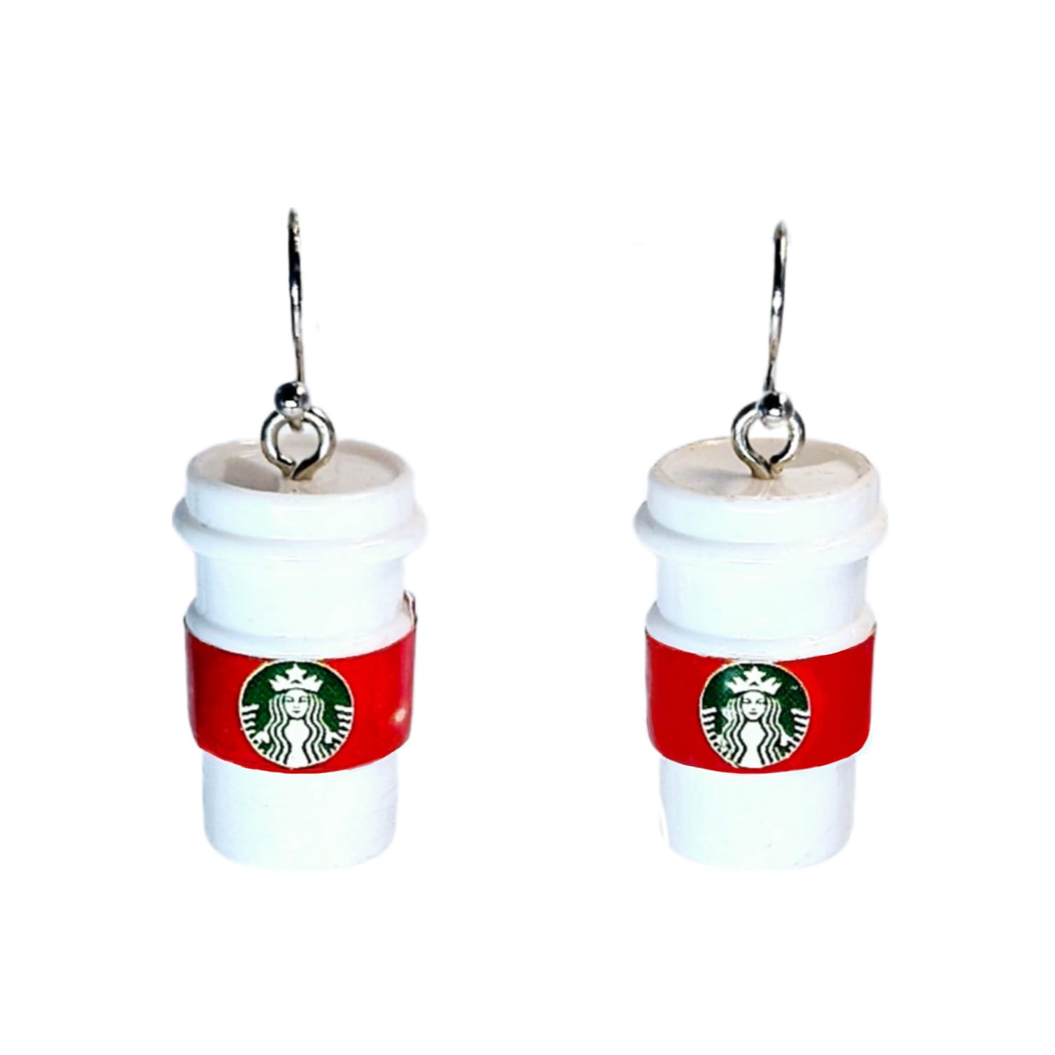 Kolczyki z zawieszkami w kształcie kubków kawy na wynos ze znanej sieci kawiarni.