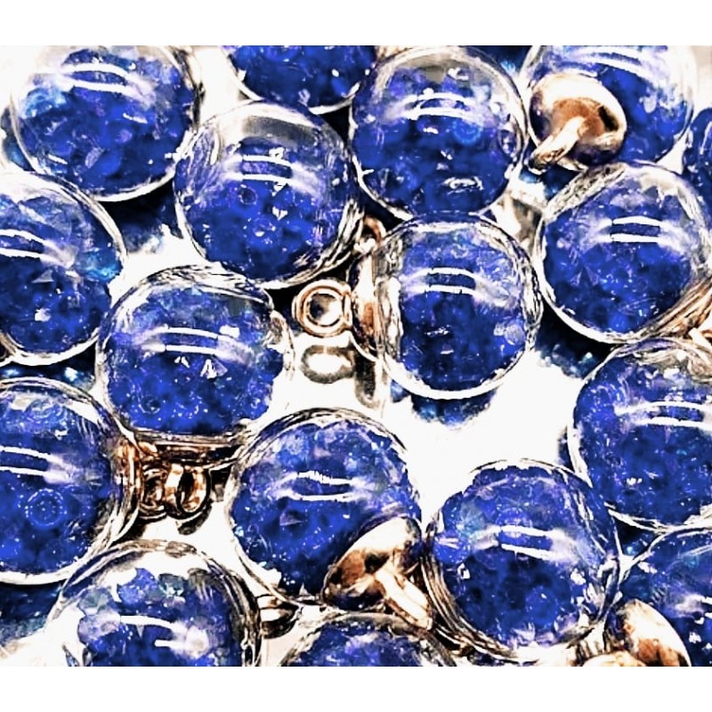 Kolczyki w kształcie szklanych kulek wypełnionych ciemno niebieskimi, prawie granatowymi cyrkoniami.
