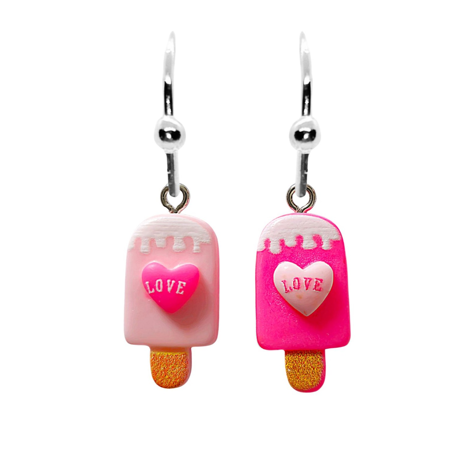 Kolczyki z zawieszkami w kształcie pary słodkich, różowych lodów na patyku z napisem love.