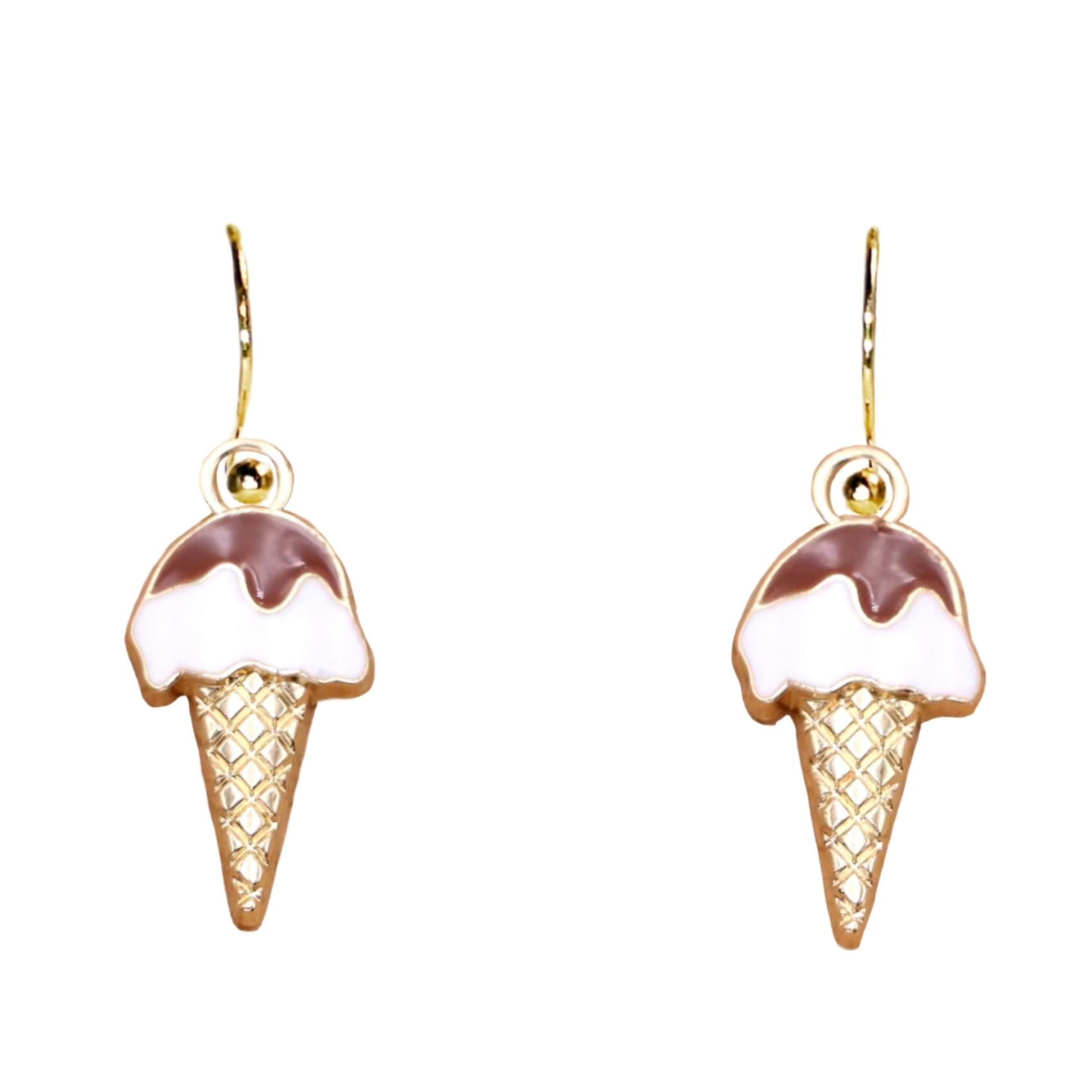 Kolczyki z zawieszkami w kształcie pary słodkich lodów czekoladowych w złotym wafelku.