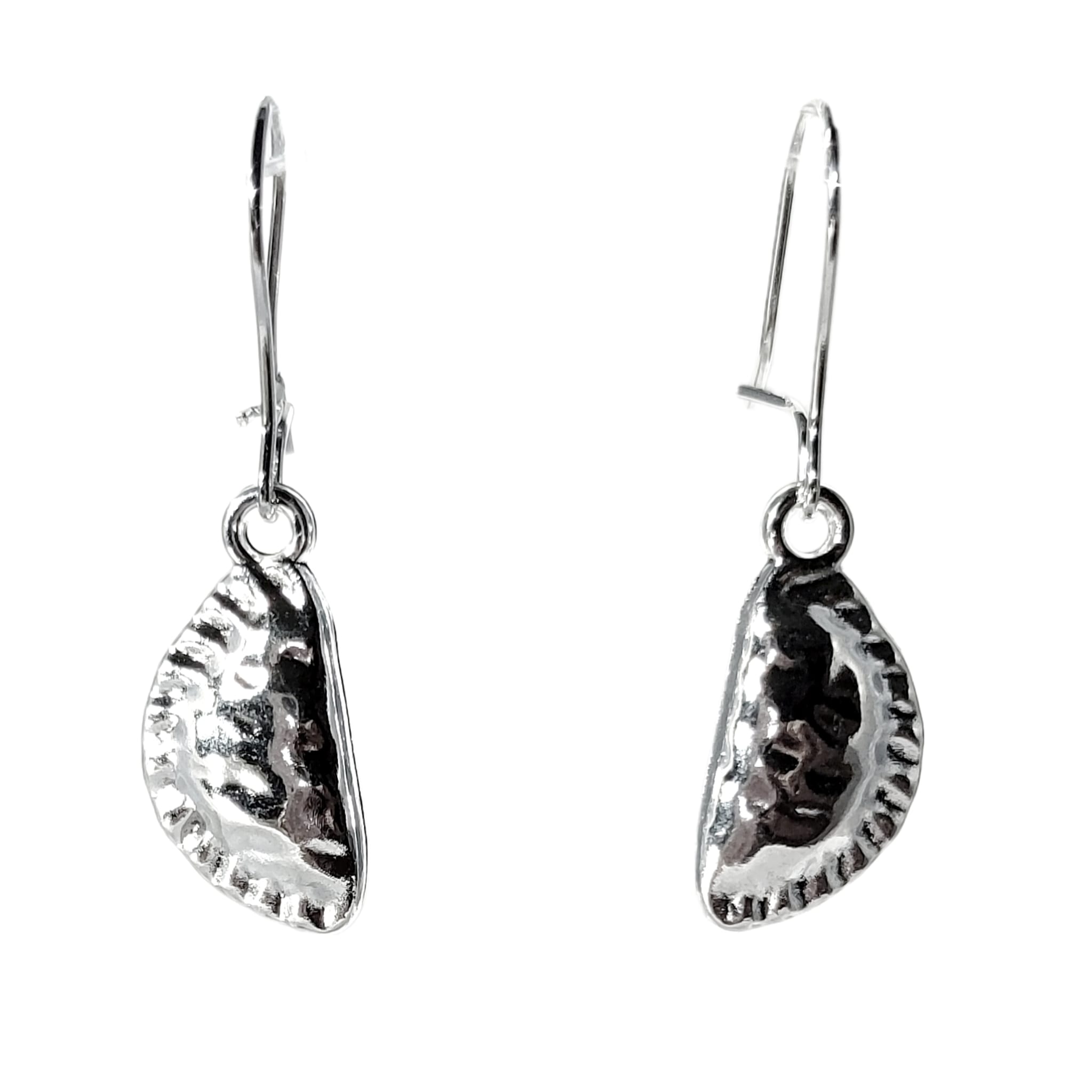 Kolczyki z zawieszkami w kształcie klasycznych, polskich pierogów w kolorze srebrnym.