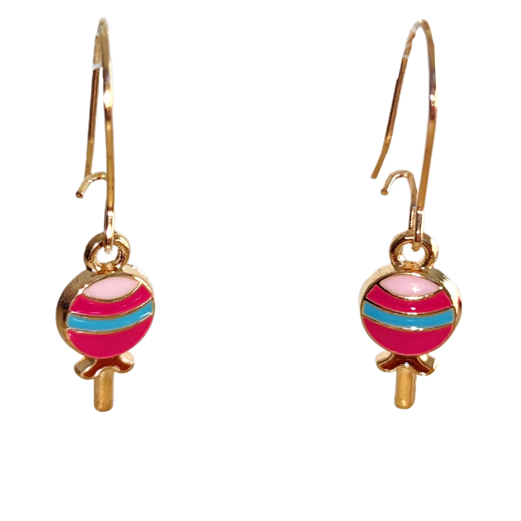 Kolczyki z zawieszkami w kształcie miniaturowych lizaków w kolorach różowym, fuksjowym i niebieskim.
