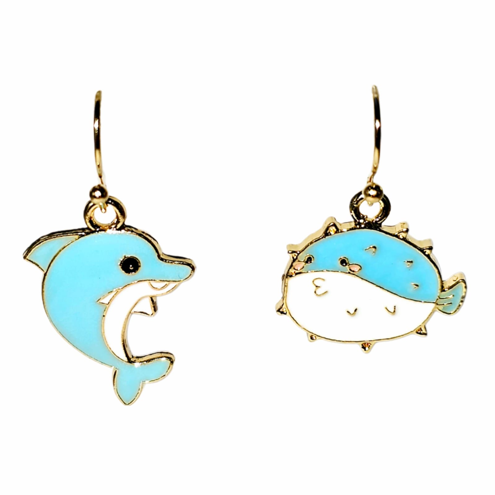 Kolczyki z zawieszkami w kształcie morskich zwierzątek: biało-błękitnych delfinka i ryby rozdymki.