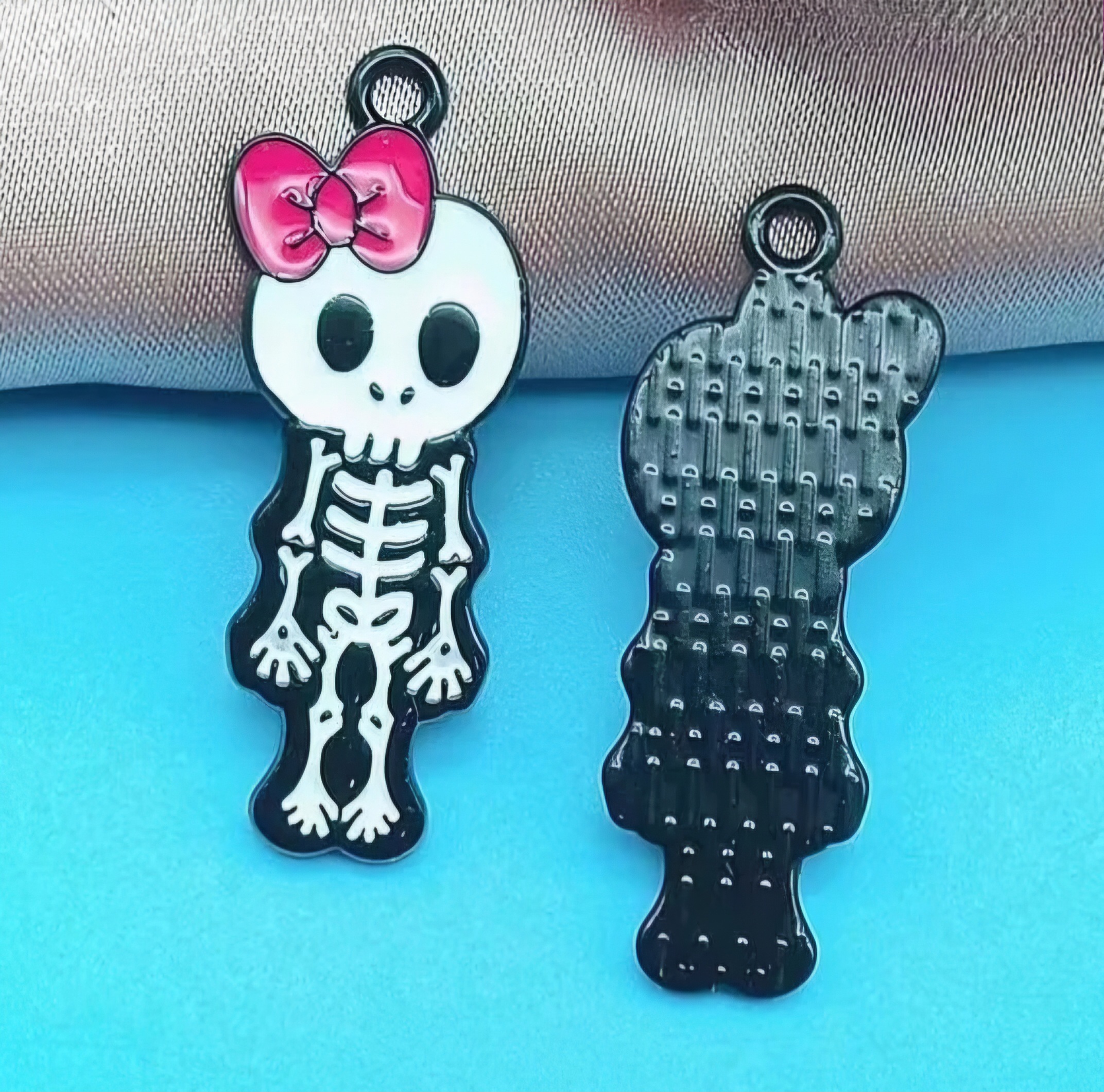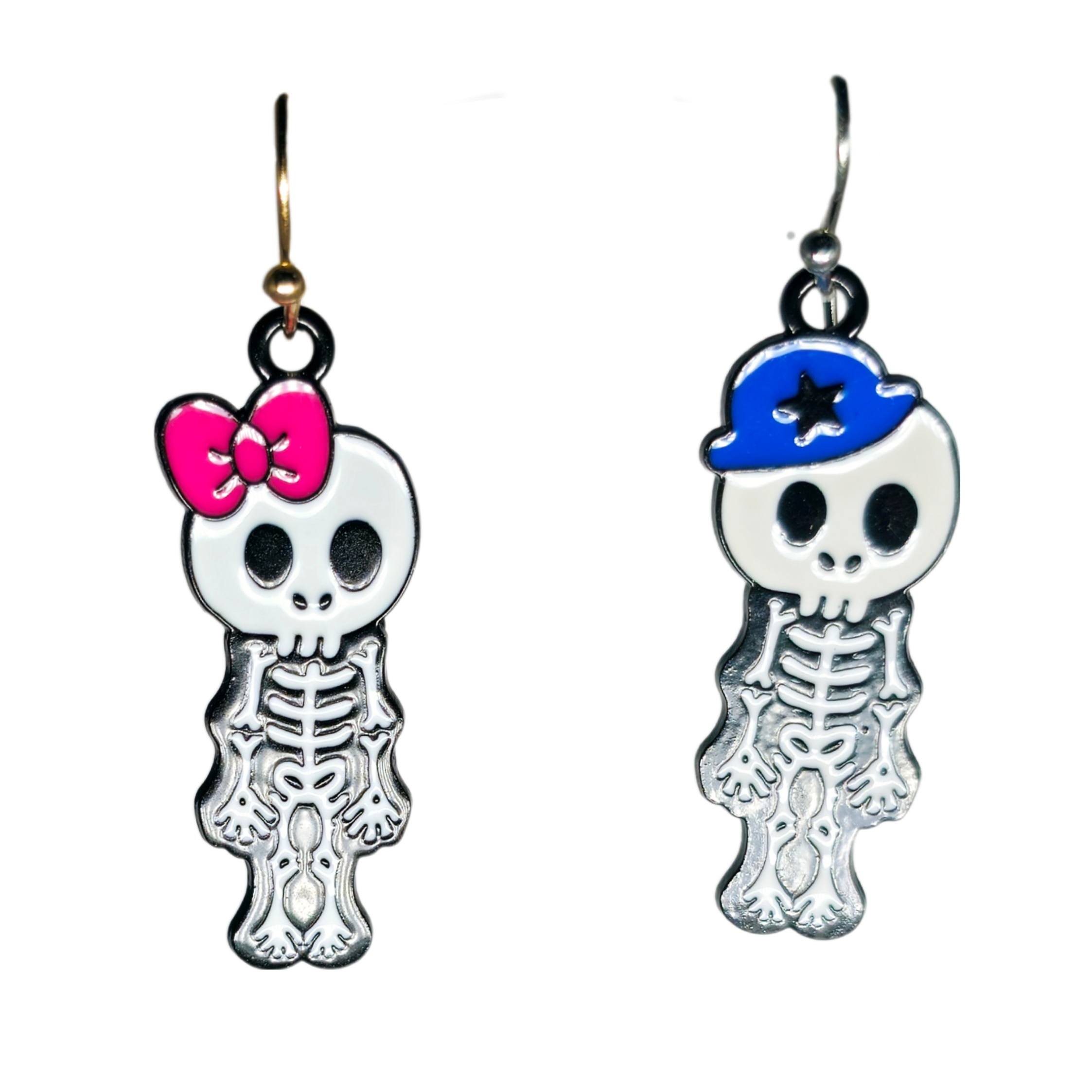 Kolczyki z zawieszkami z dwoma sympatycznymi kościotrupami, dziewczynką i chłopczykiem.