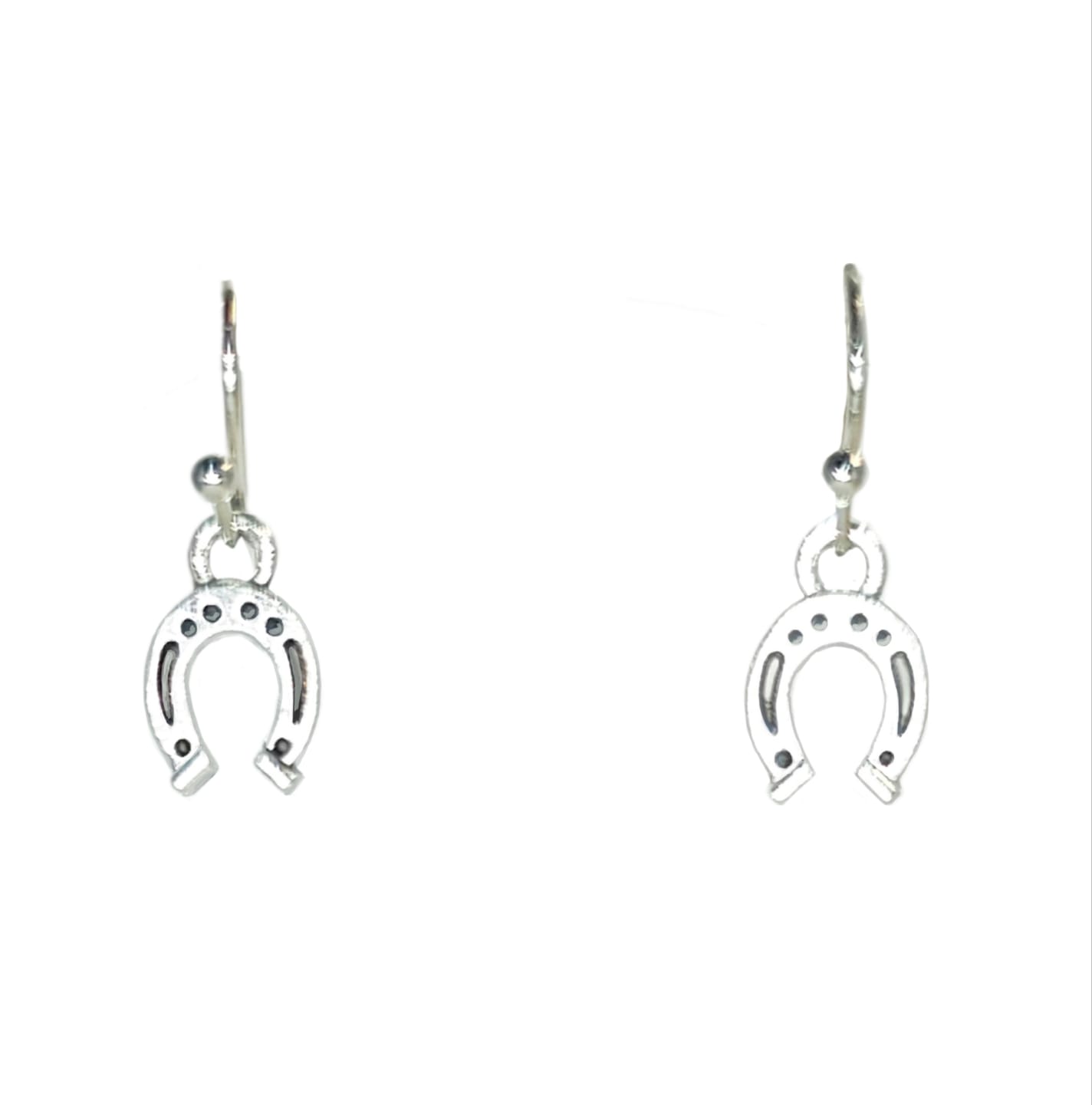 Kolczyki z zawieszkami w kształcie podkówek na szczęście w kolorze srebrnym.