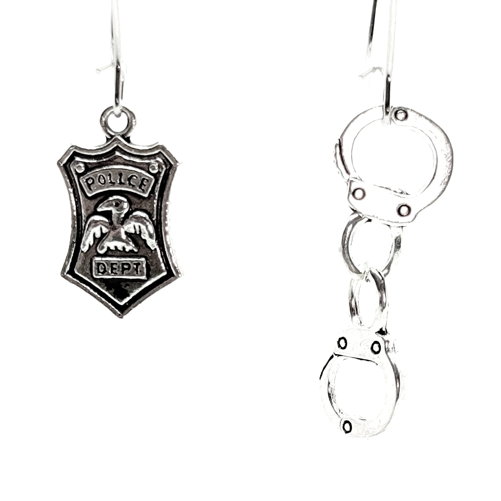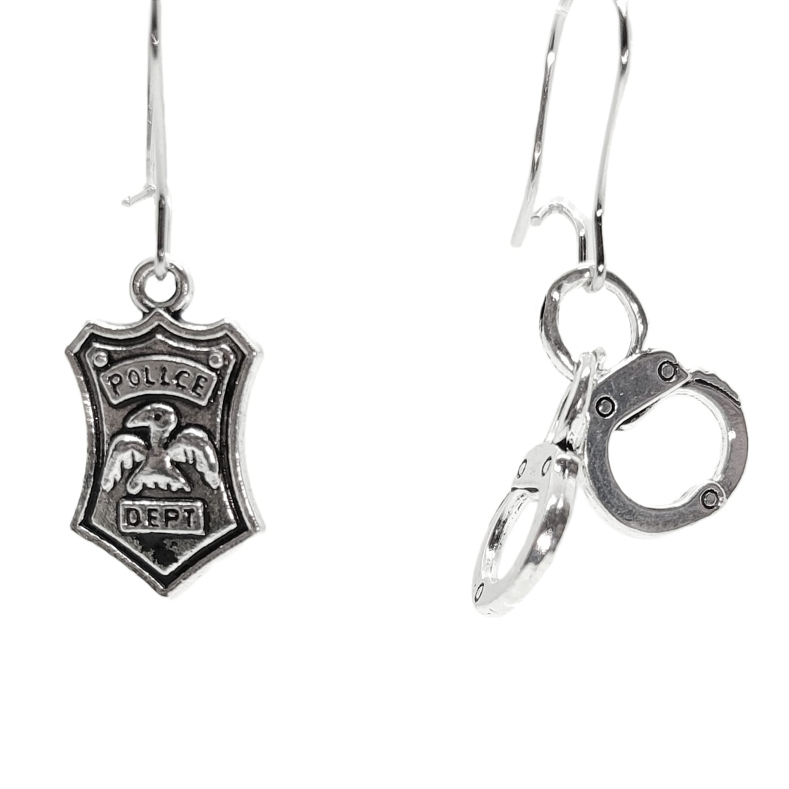 Kolczyki z zawieszkami w kształcie podstawowego zestawu policjanta: blachy policyjnej oraz kajdanek.