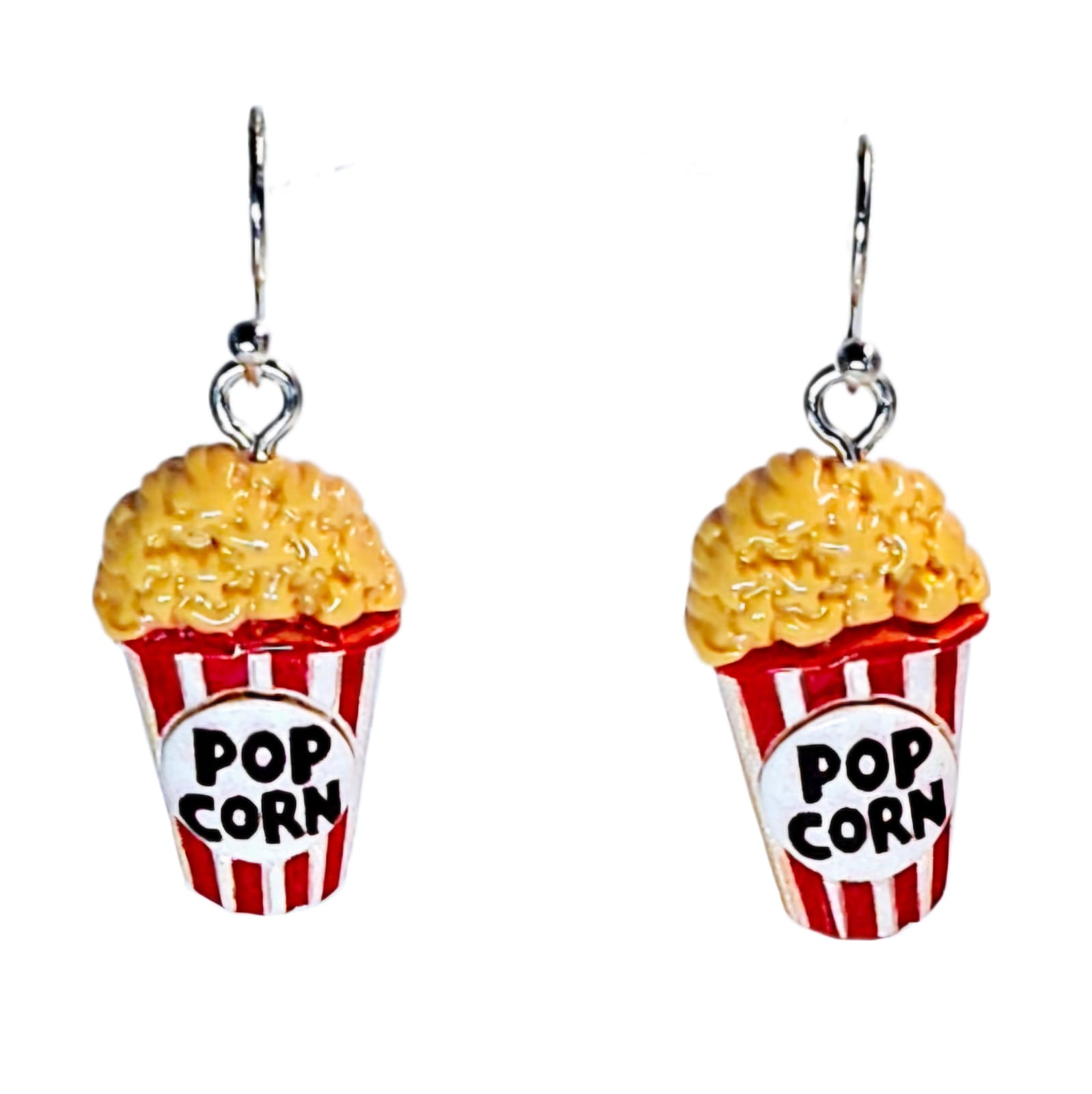 Kolczyki z zawieszkami w kształcie kubełków wypełnionym popcornem karmelowym.