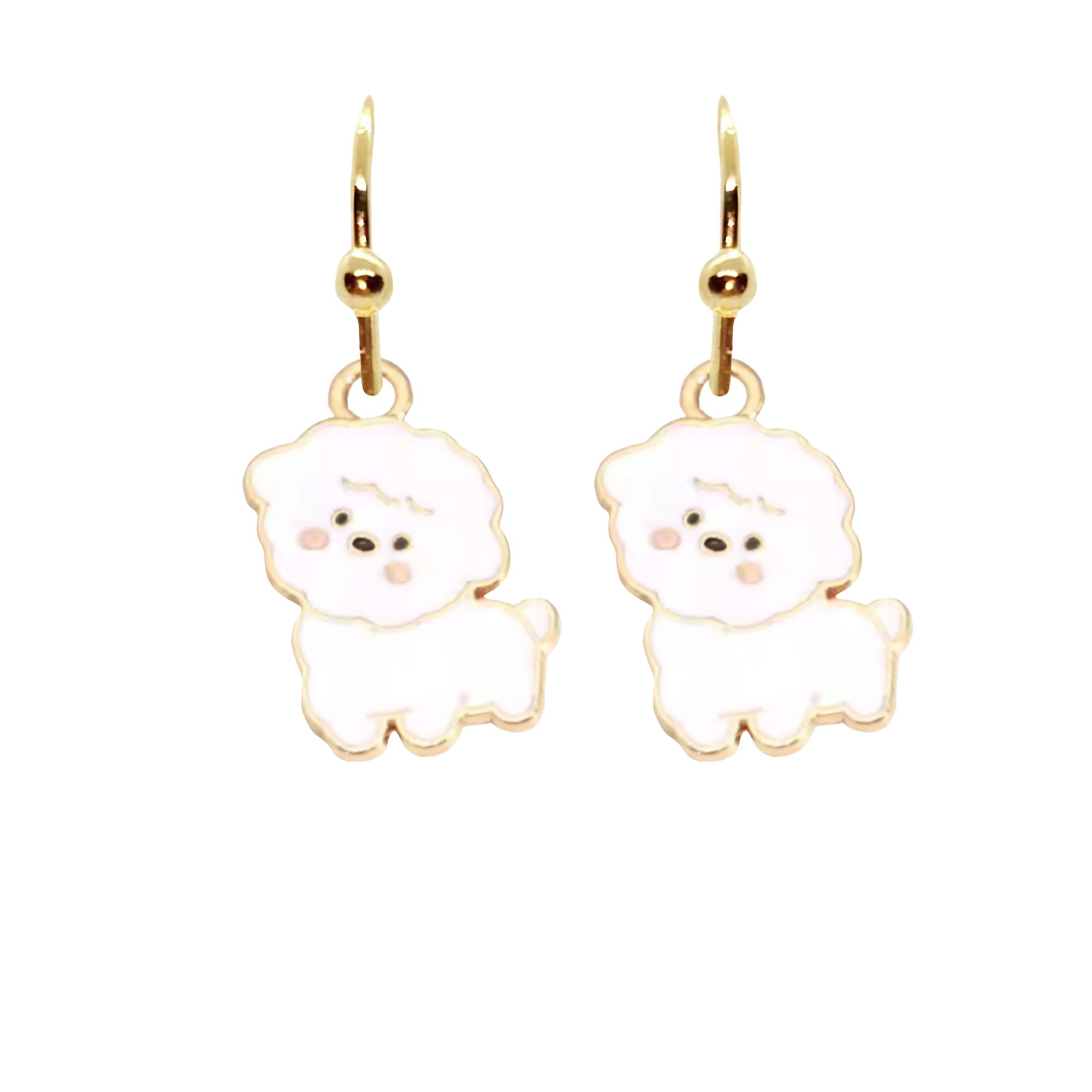 Kolczyki z zawieszkami w kształcie uśmiechniętych piesków rasy maltańczyk.