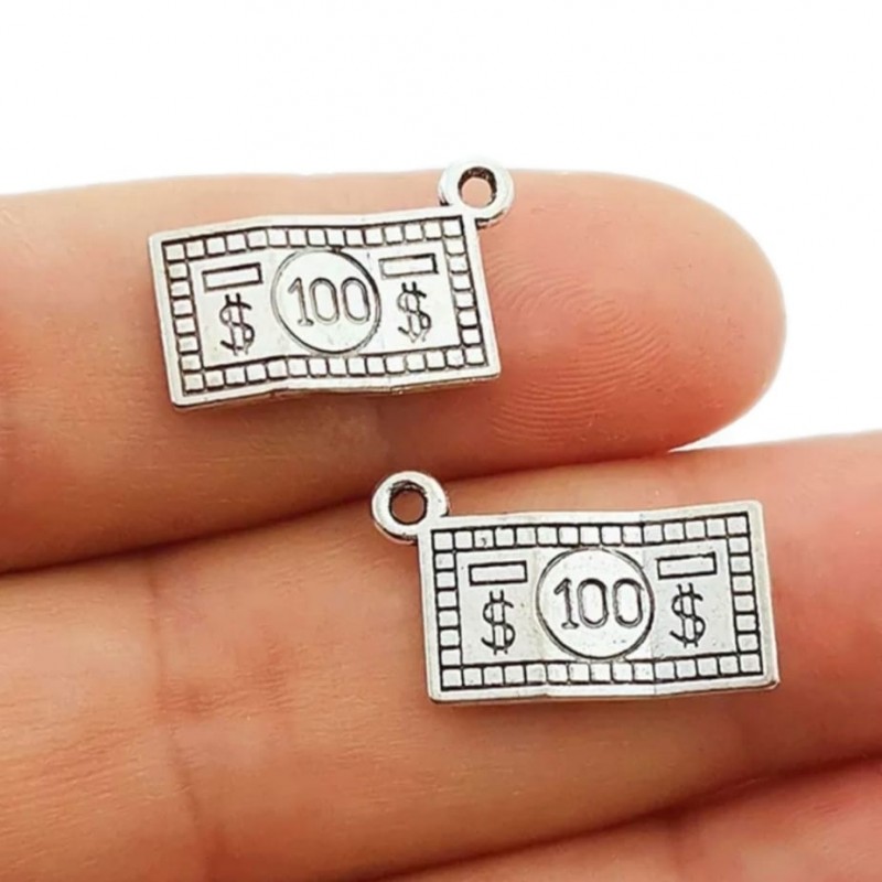 Kolczyki z zawieszkami w kształcie sakiewki pieniędzy i banknotu w kolorze srebrnym.