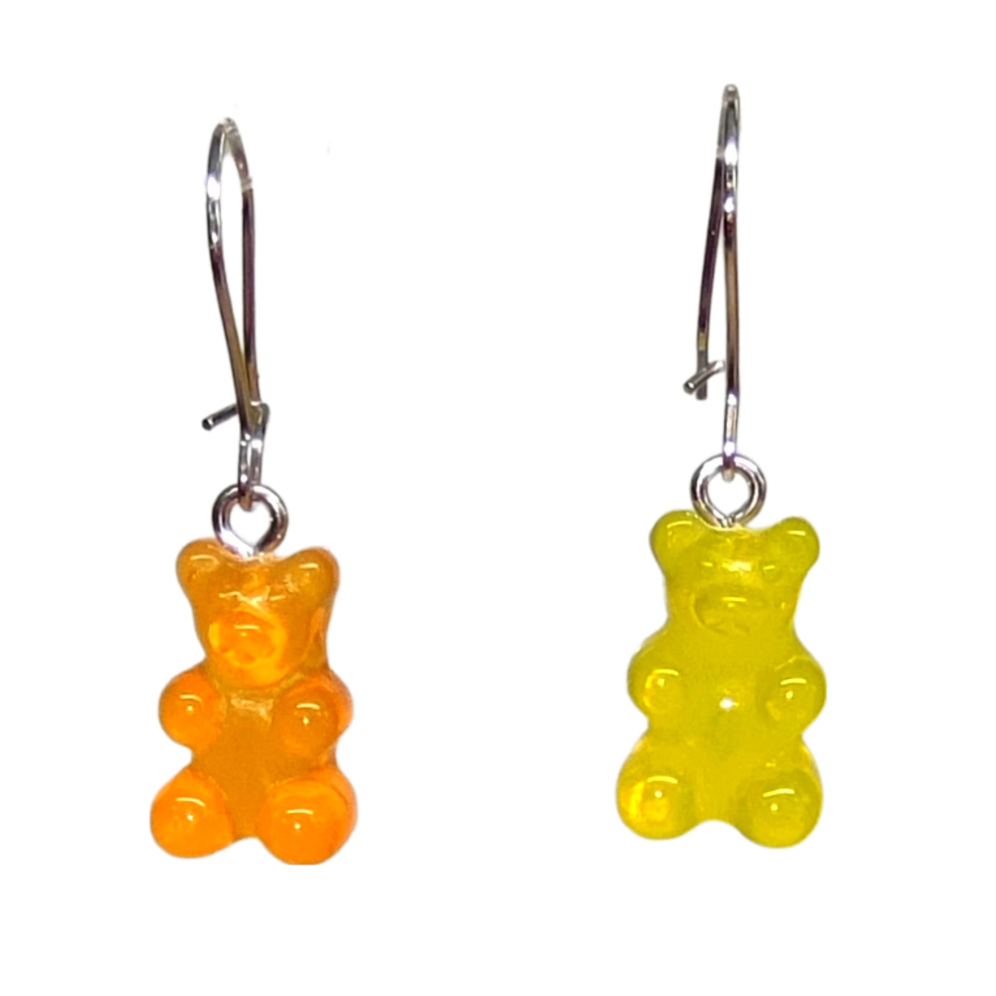 Kolczyki z zawieszkami w kształcie misiów -żelków w kolorach żółtym i pomarańczowym.