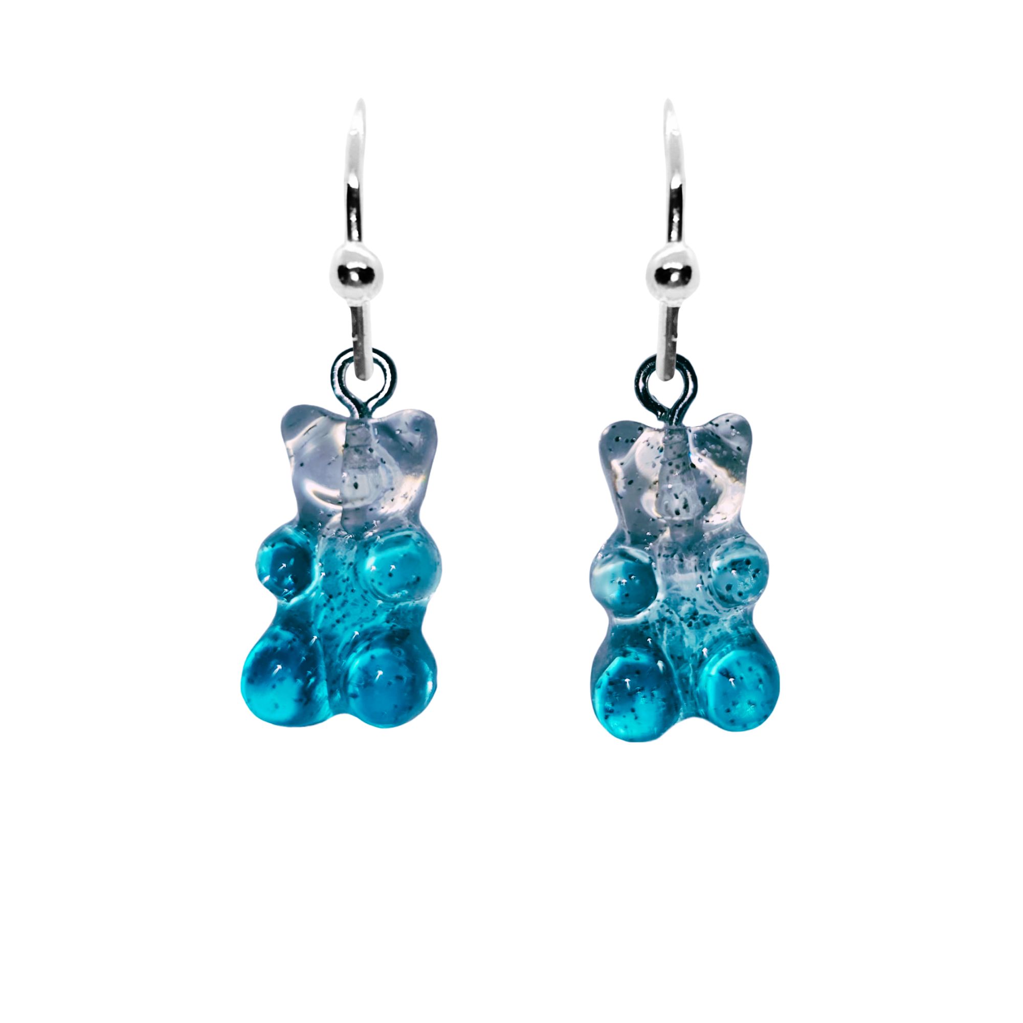 Kolczyki z zawieszkami w kształcie misiów -żelków w w kolorze kropli wody z drobinkami brokatu.