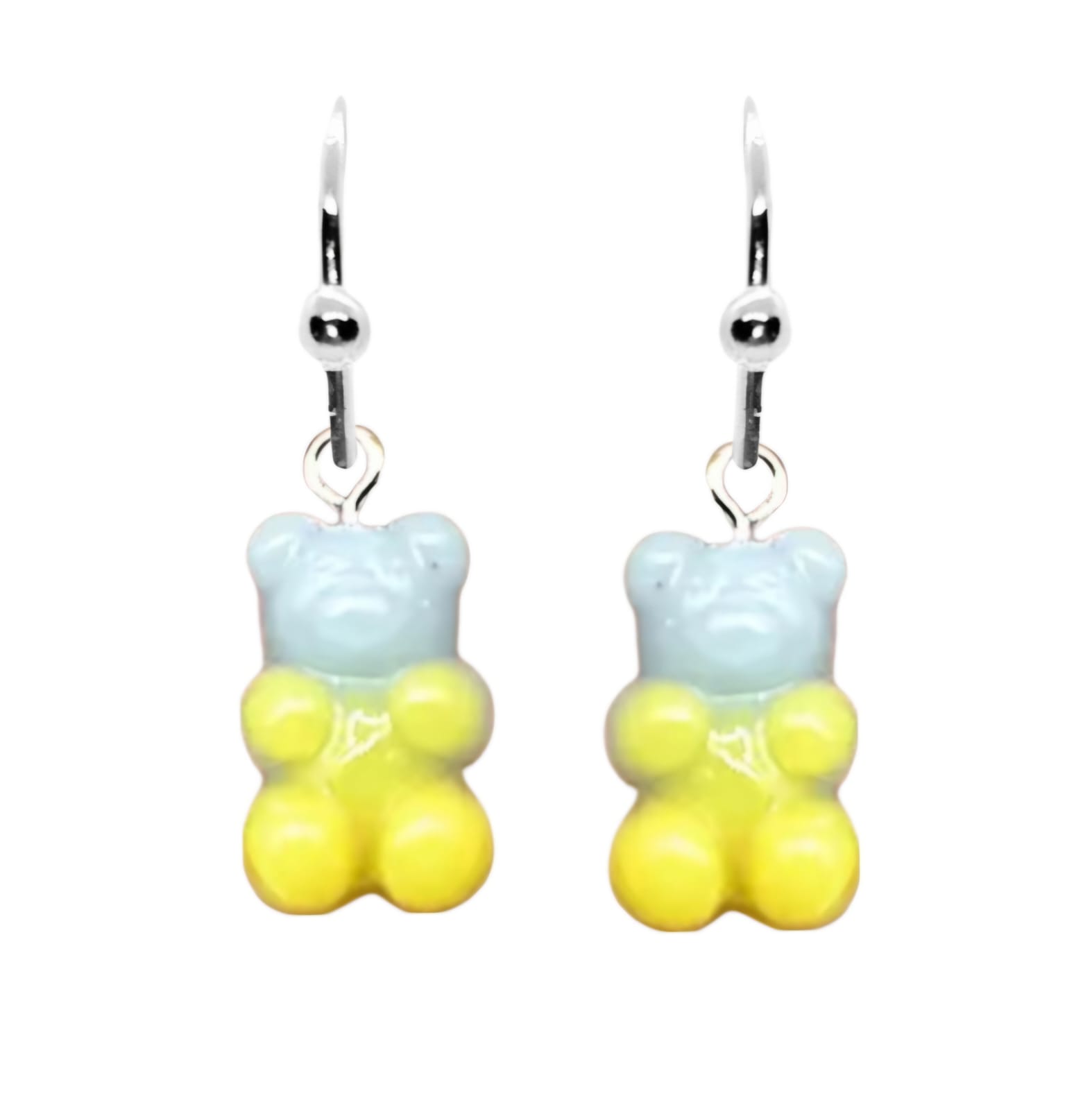 Kolczyki z zawieszkami w kształcie misiów -żelków w odcieniach błękitno – żółtego ombre.
