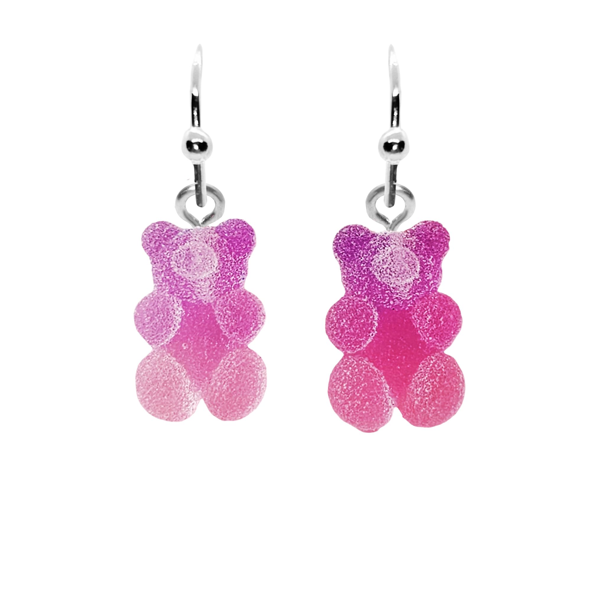 Kolczyki z zawieszkami w kształcie misiów -żelków w odcieniach fioletu ombre, posypanych kwaśno – cukrową posypką.