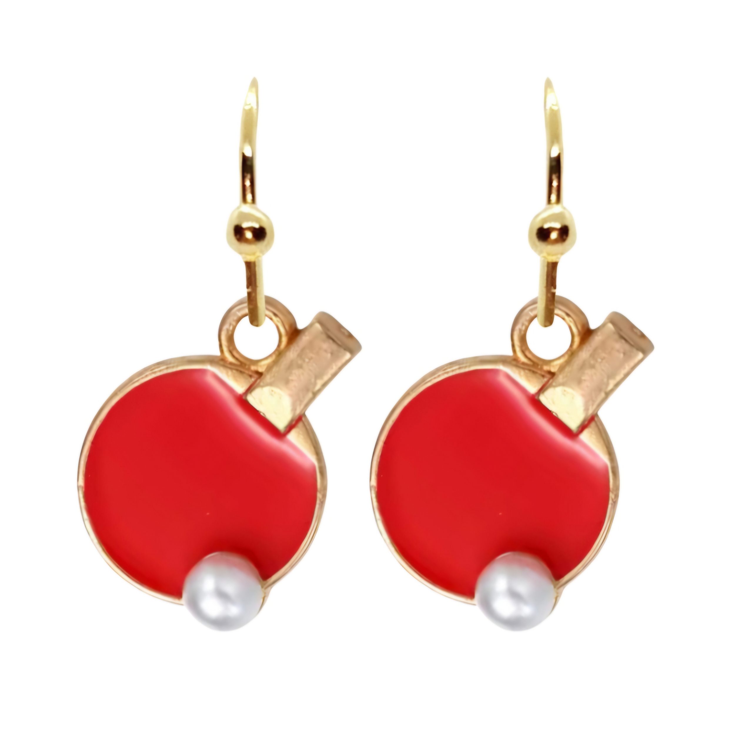 Kolczyki w kształcie paletek z piłeczkami do ping-ponga.