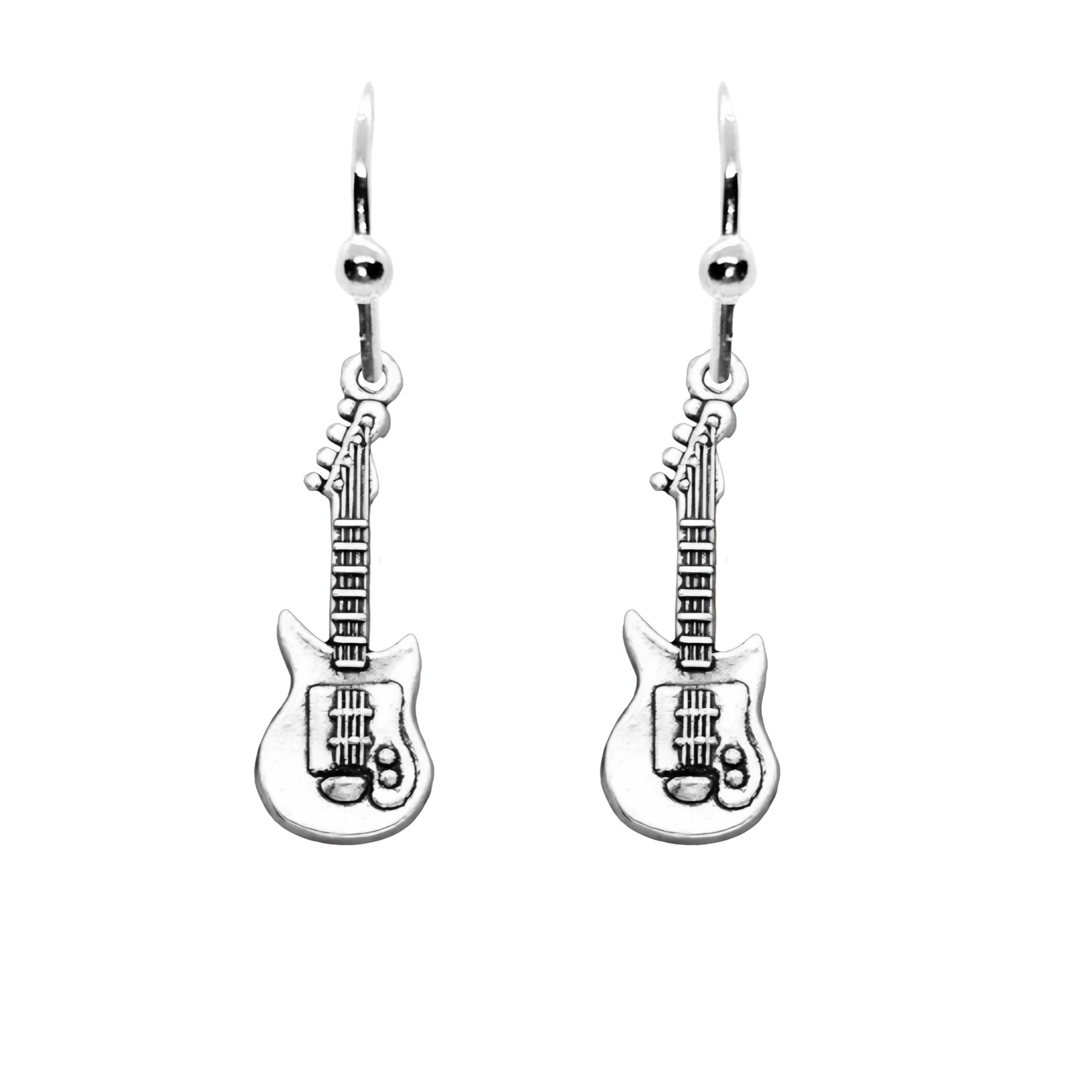 Kolczyki w kształcie miniaturowych srebrnych gitar.
