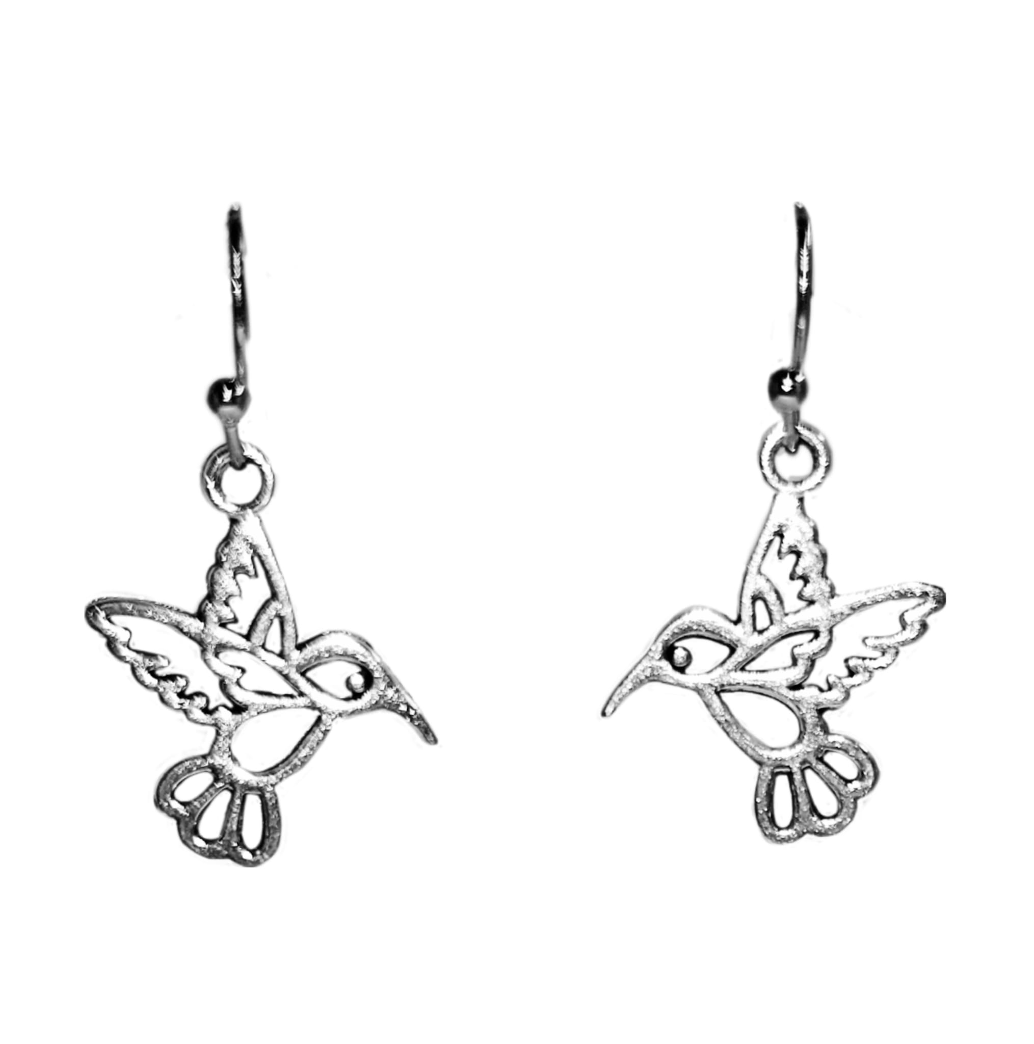 Kolczyki z zawieszkami w kształcie pary kolibrów w kolorze srebrnej stali.