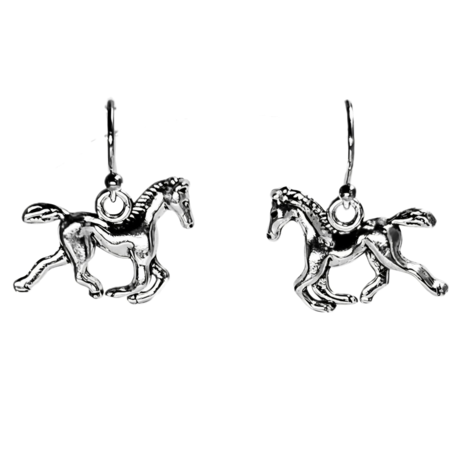 Kolczyki z zawieszkami w kształcie koni w galopie w srebrnym kolorze.