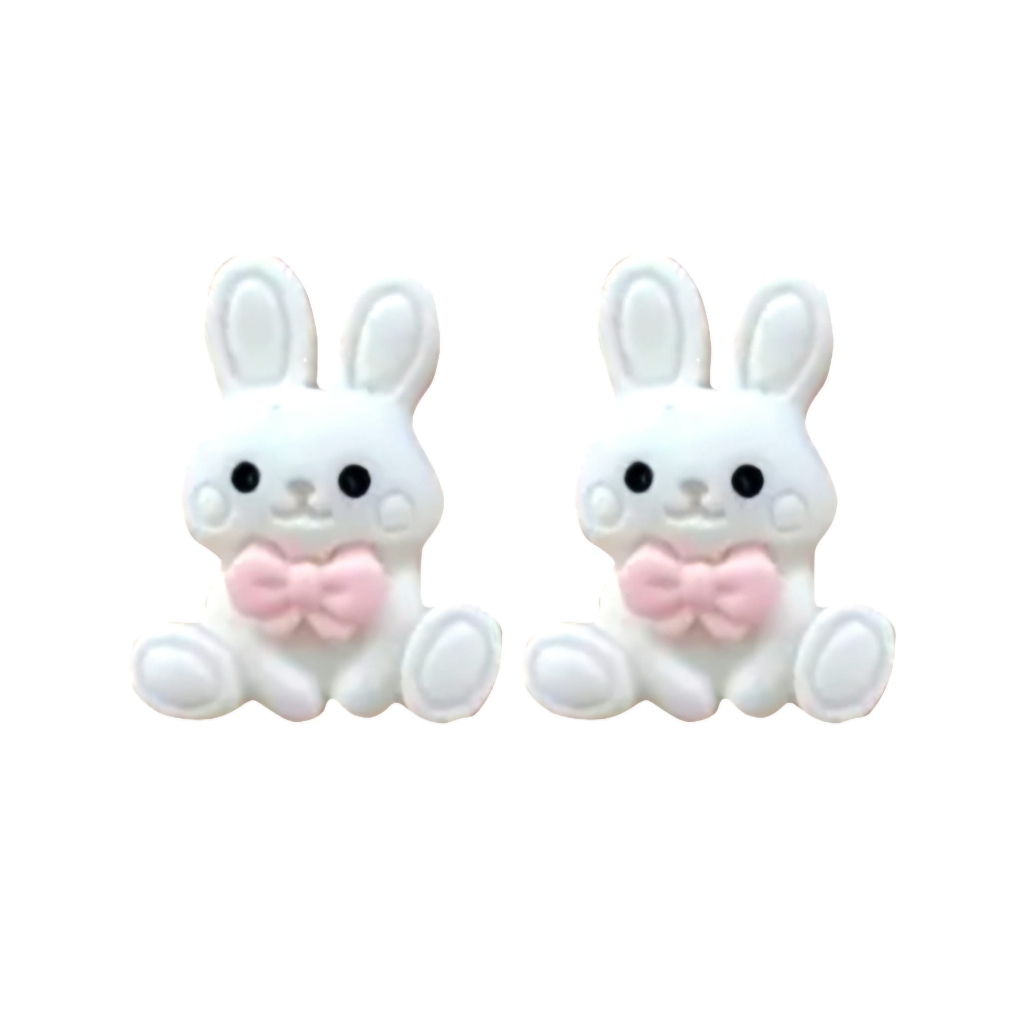 Kolczyki na sztyfcie z wizerunkiem słodkich, białych króliczków z różowymi kokardami.
