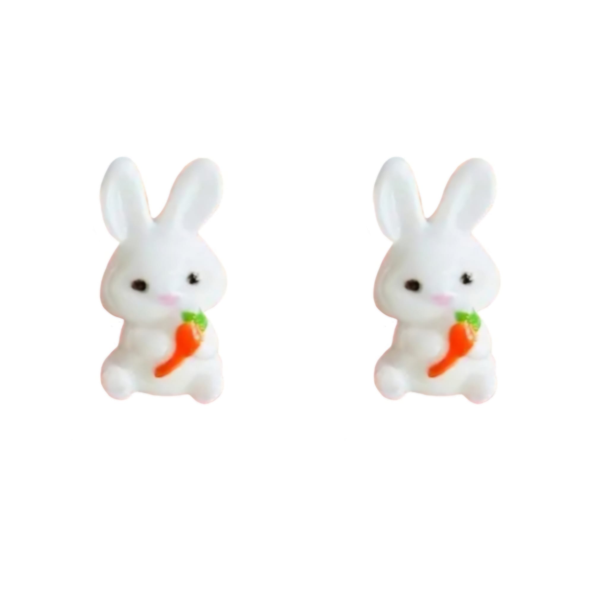 Kolczyki na sztyfcie z wizerunkiem słodkich, białych króliczków z marchewkami.