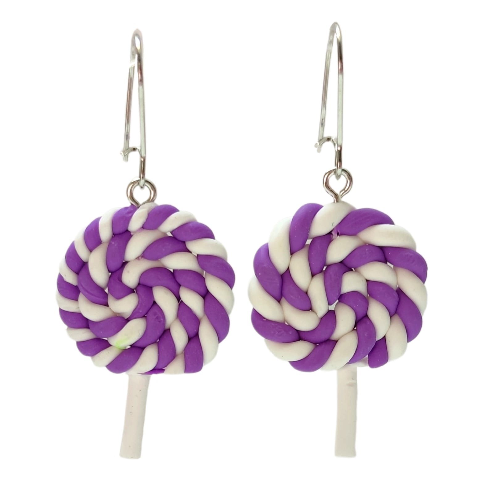 Kolczyki z zawieszkami w kształcie tęczowych, zakręconych lizaków w kolorach fioletowo – białym.