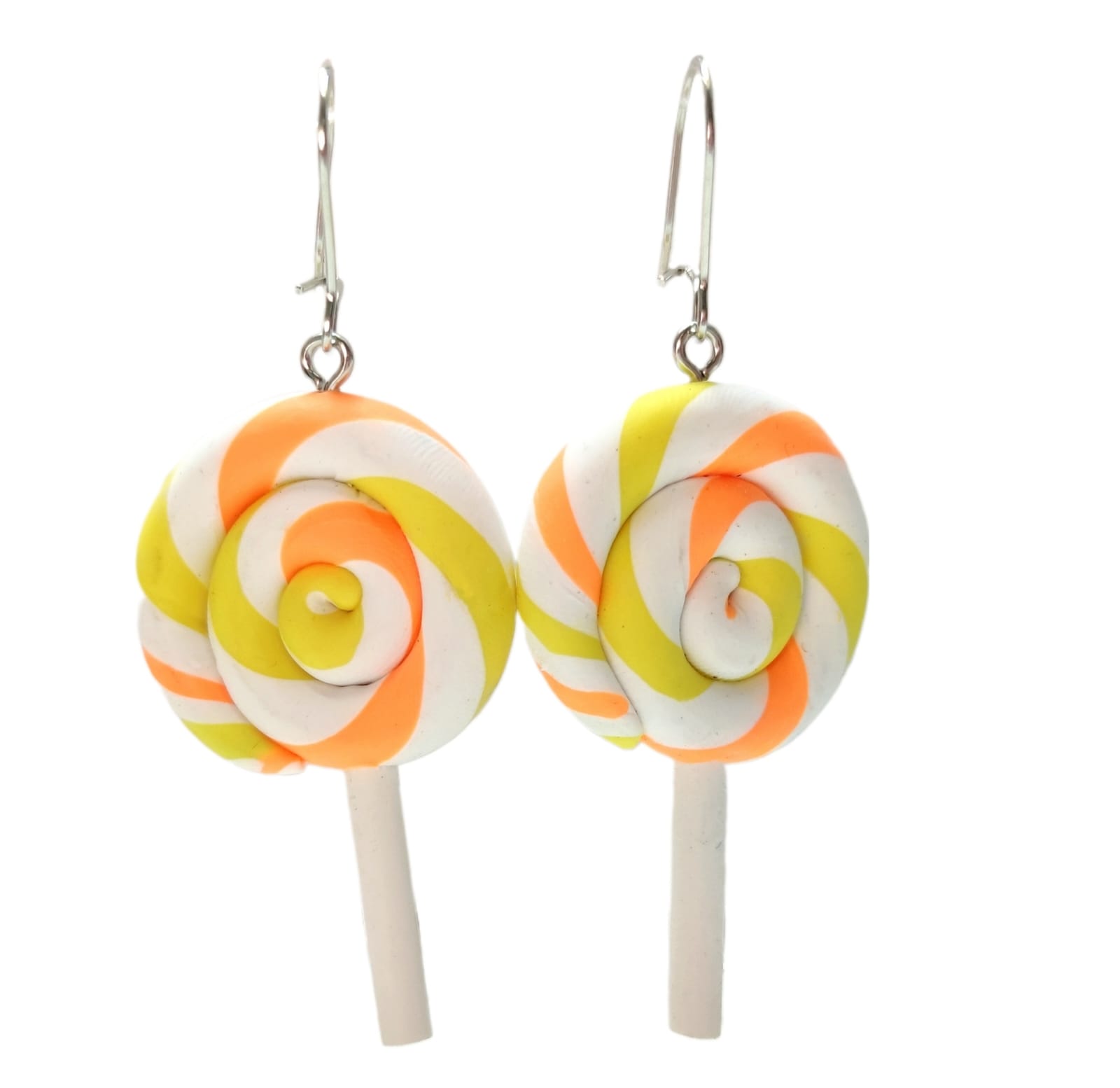 Kolczyki z zawieszkami w kształcie tęczowych, zakręconych lizaków w kolorach pomarańczowo – żółto – białym.