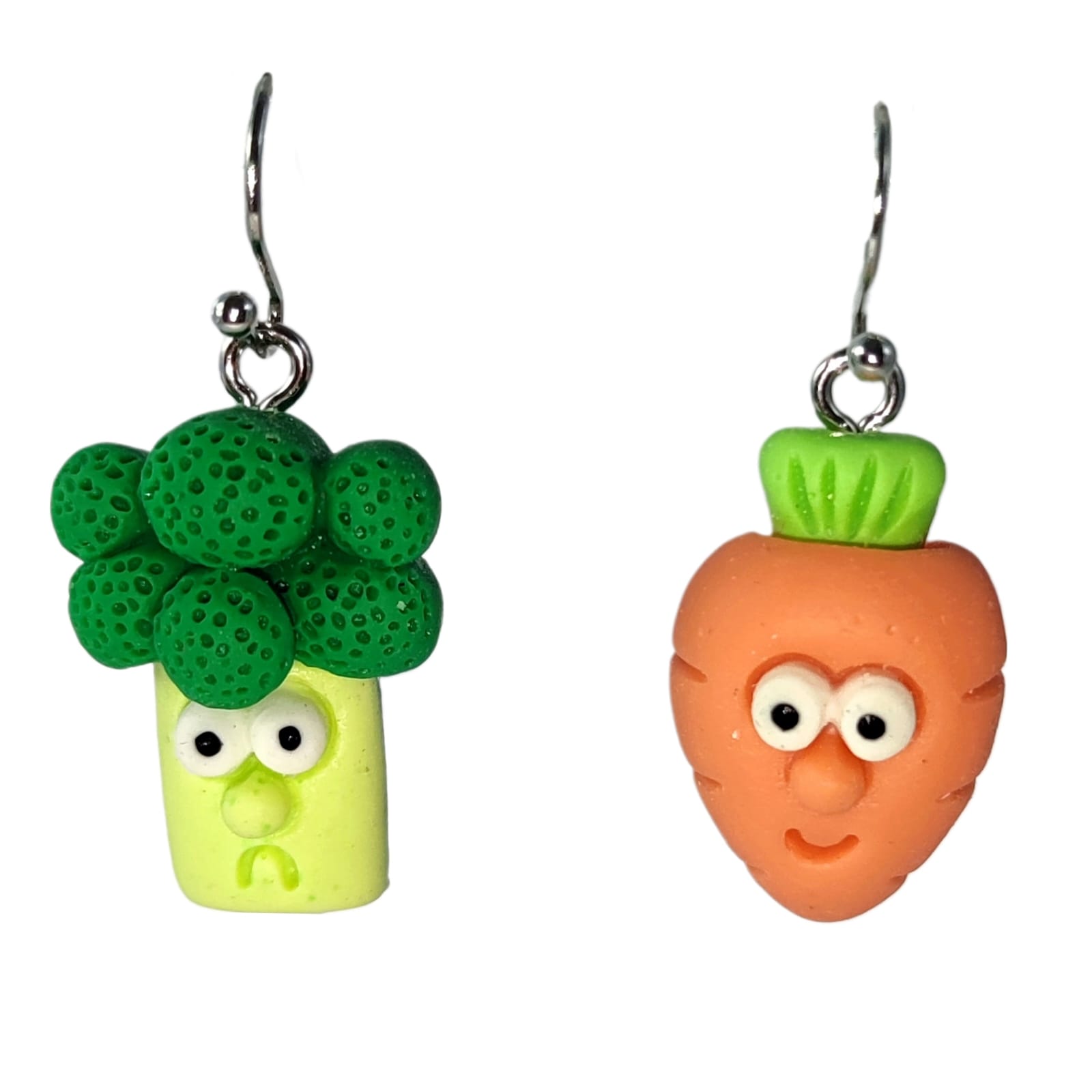 Kolczyki z zawieszkami w kształcie smutnego brokuła i uśmiechniętej marchewki.