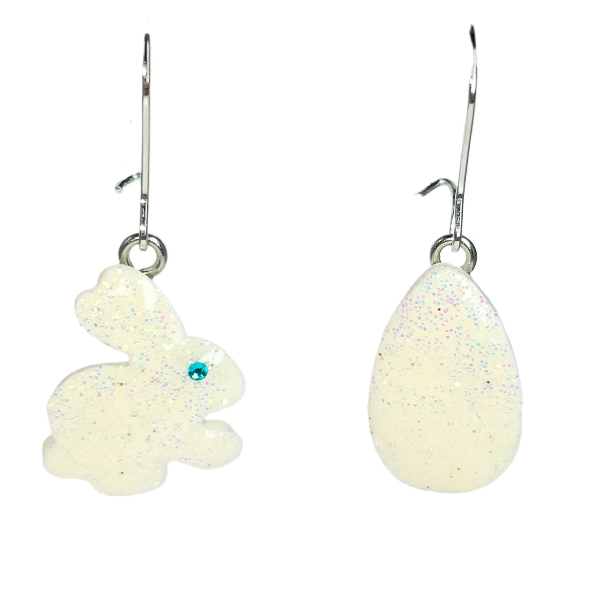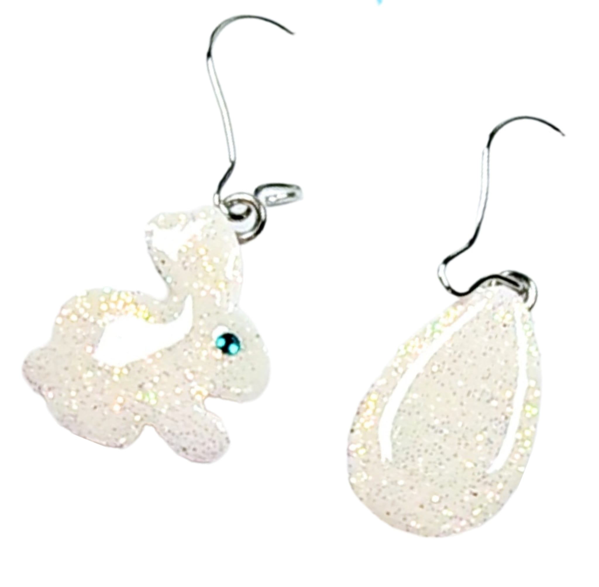 Wiszące kolczyki z zawieszką w postaci wielkanocnego zajączka i pisanki błyszczącej brokatem w odcieniach zieleni.