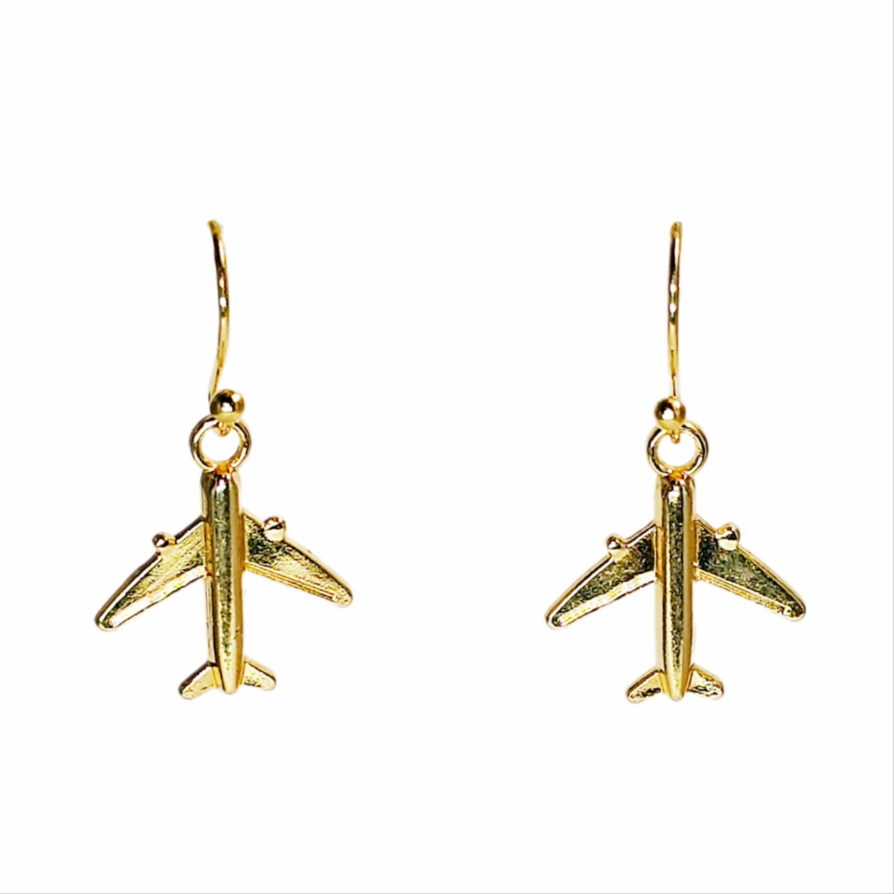 Kolczyki z zawieszkami w kształcie samolotów pasażerskich w kolorze złotym.