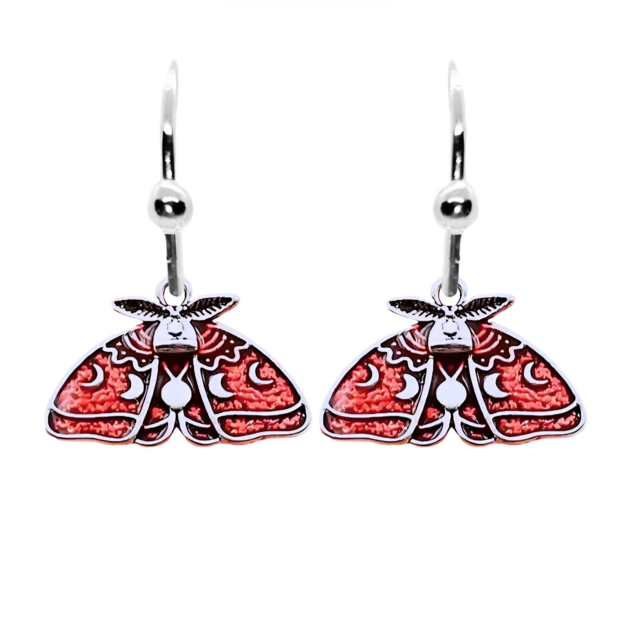 Kolczyki w stylu gotyckim z zawieszkami w kształcie srebrno – czerwonych ciem.
