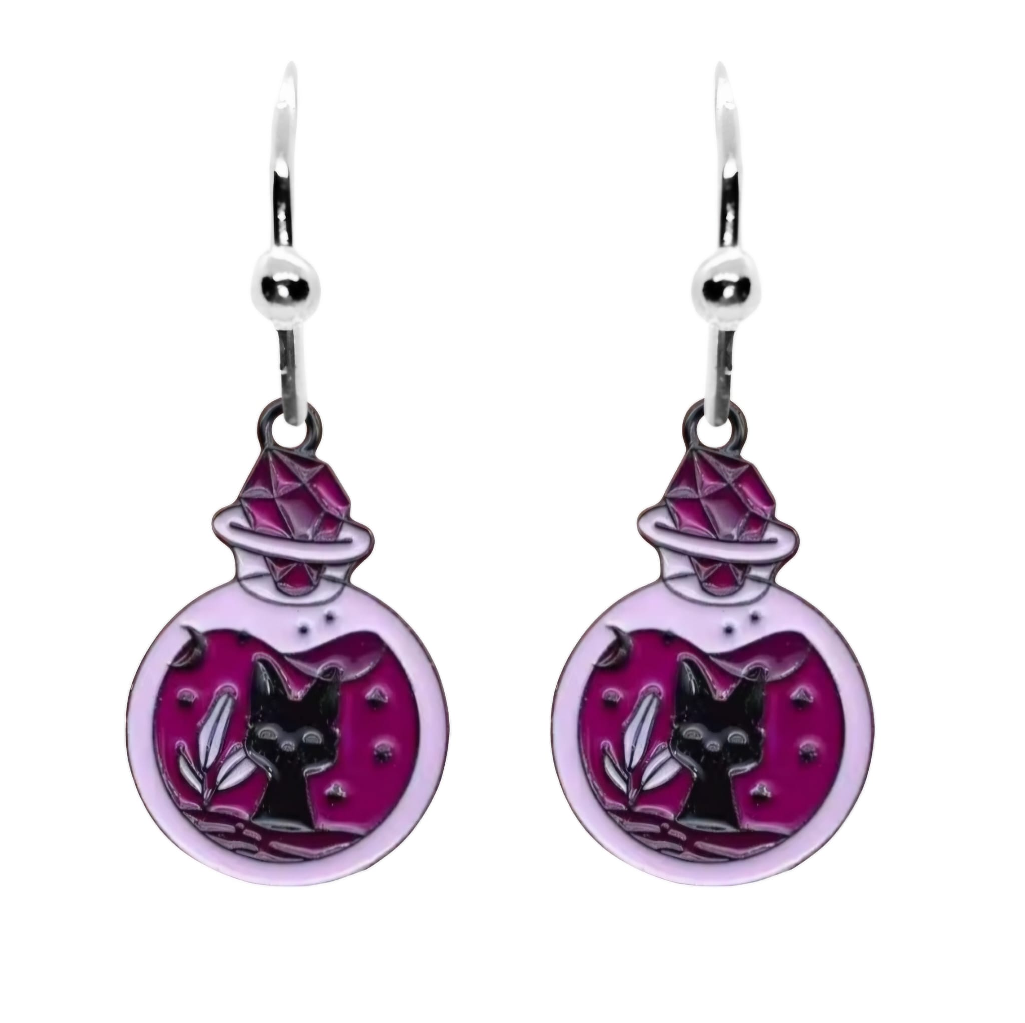 Kolczyki w stylu gotyckim z zawieszkami w kształcie butelek z eliksirem i siedzącym w środku kotku.