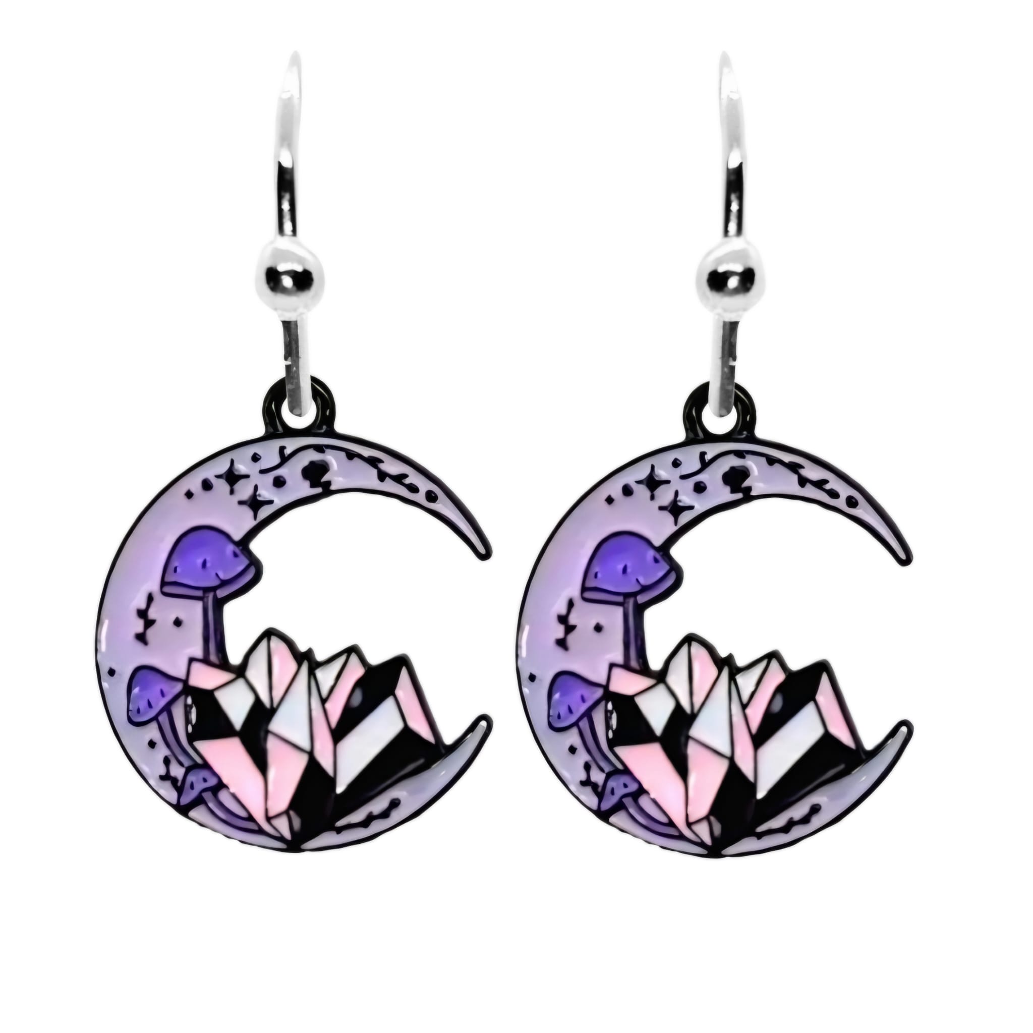 Kolczyki w stylu gotyckim z zawieszkami w kształcie czarodziejskich księżyców z kryształami i grzybkami.