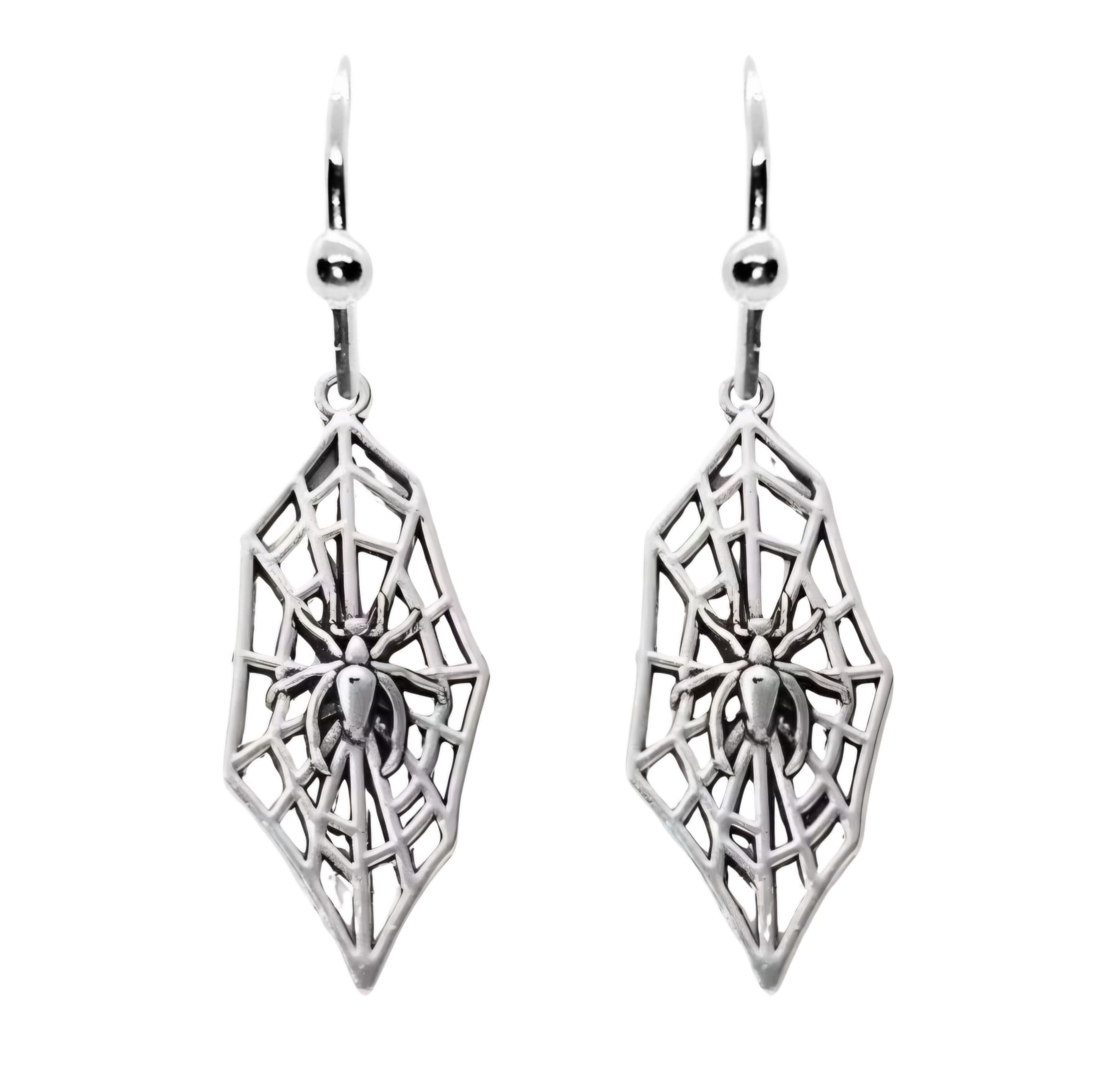 Kolczyki w stylu gotyckim z zawieszkami w kształcie podłużnych pajęczyn z pająkami.