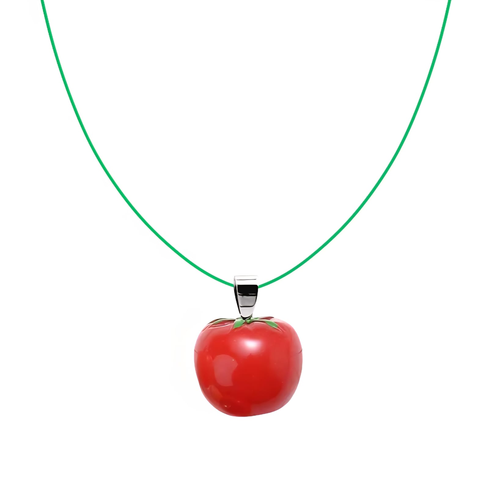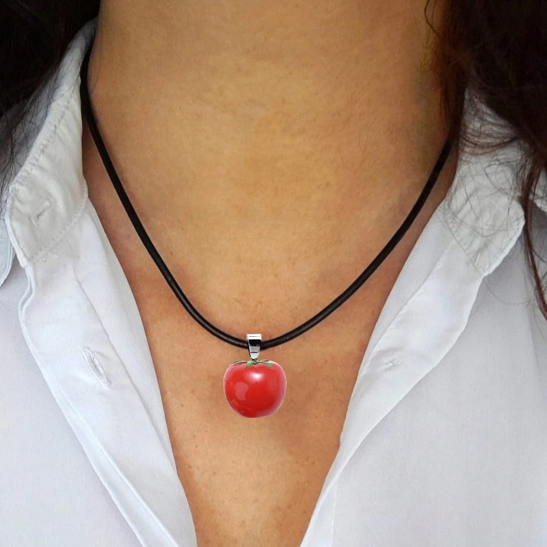 Naszyjnik z zawieszką przypominającą dojrzałego, czerwonego pomidora.