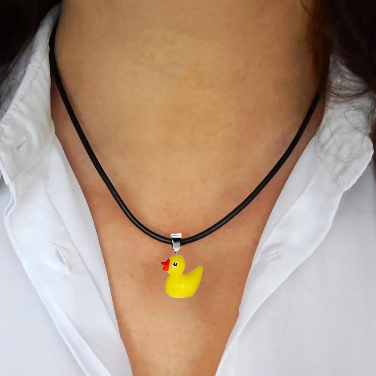 Naszyjnik z zawieszką w kształcie małej, żółtej kaczuszki.